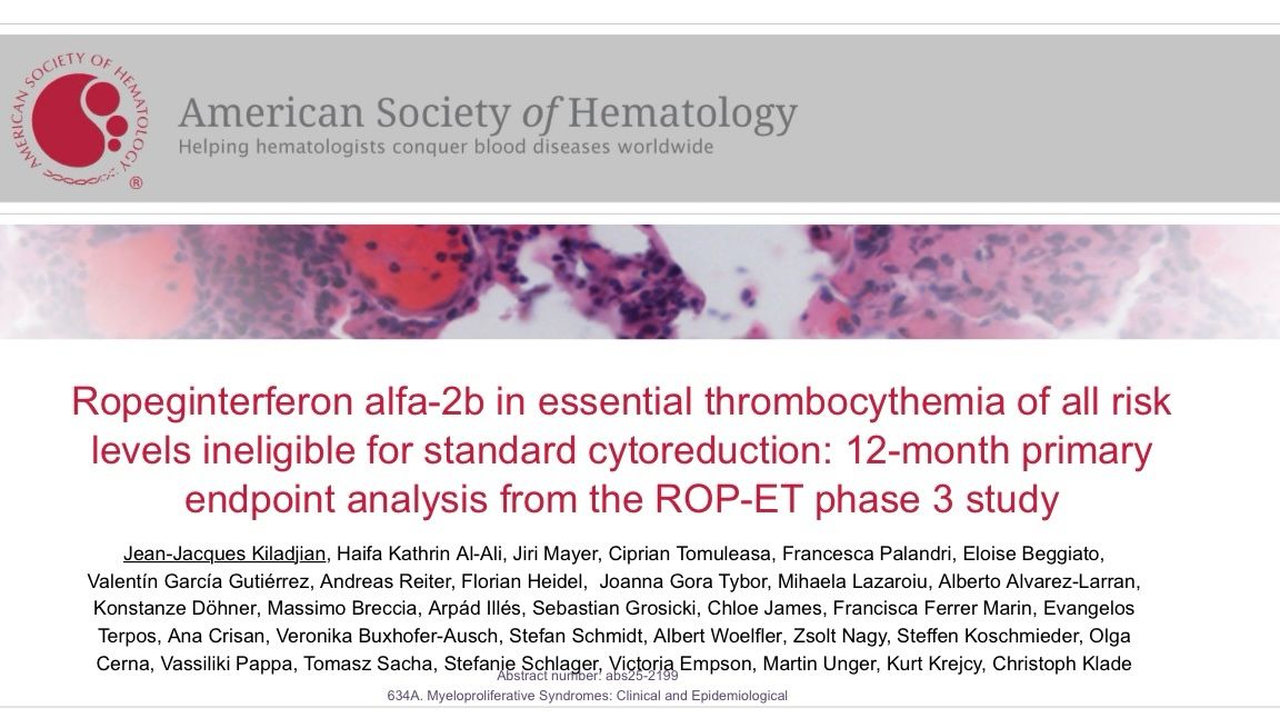 ”Proud to have presented at American Society of Hematology ASH25 , on behalf of my co-investigators from 10 European countries, the first results of the ROP-ET study showing that ropeginterferon-alpha 2b is also an effective and safe treatment for patients with essential thrombocythemia ET who have no other therapeutic option.