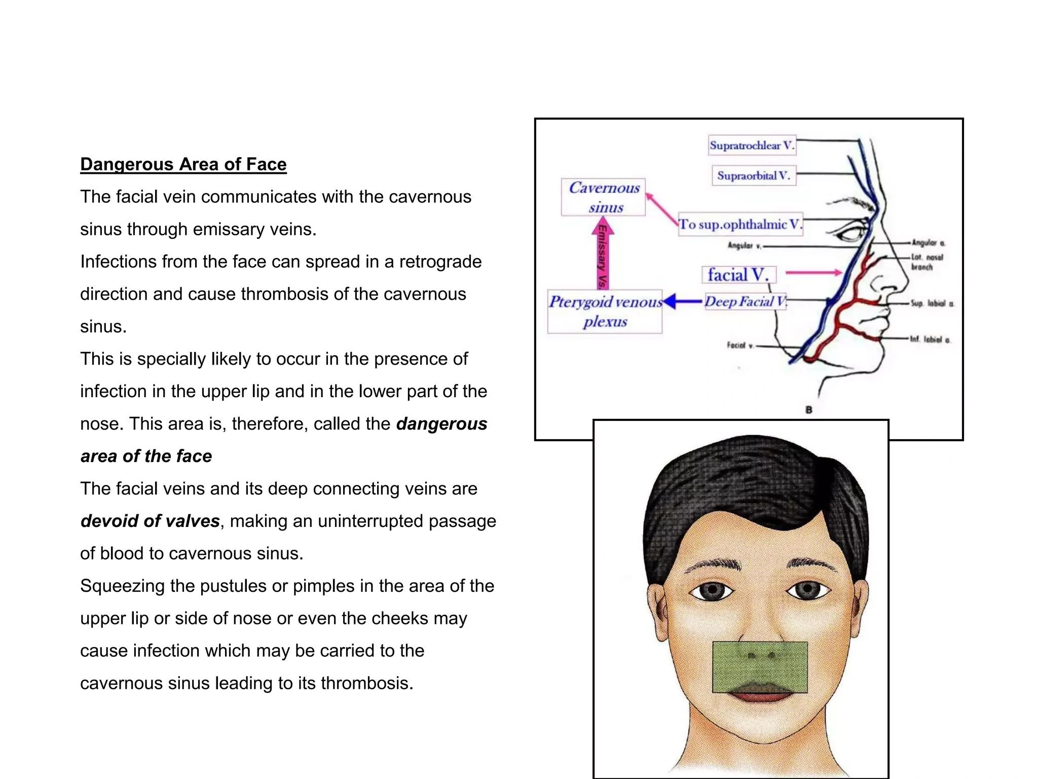 In summary, the dangerous triangle highlights the importance of being careful with skin infections in this facial area due to the direct connection to the brain and the risk of severe complications.”