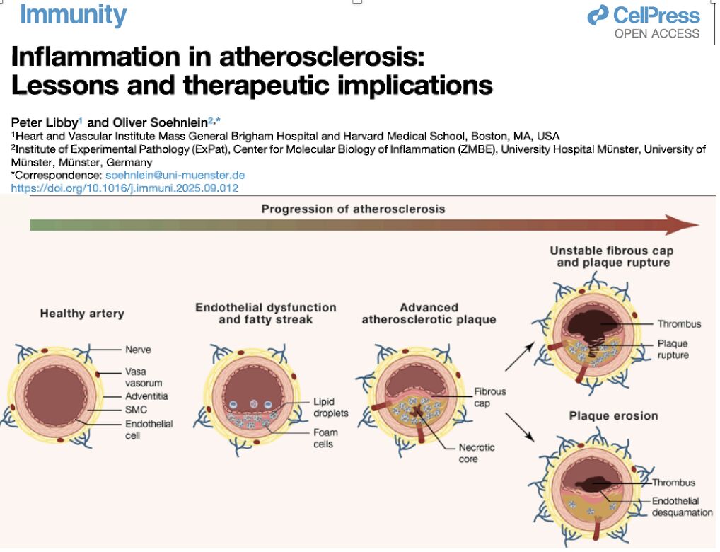 “Oliver Soehnlein led our update on inflammation in atherosclerosis and the opportunities for novel therapies to quench the smoldering within the plaque and improve clinical outcomes. Table 1 features “Emerging preclinical interference strategies aimed at reducing atherosclerosis” and Figure 5 presents a “Timeline of major milestones of research connecting inflammation with atherosclerosis” which we hope ongoing studies and clinical trials will soon extend as we seek the “sweet spot” of calming inflammation while avoiding undue interference with host defenses or tumor surveillance. Libby and Soehnlein, Inflammation in atherosclerosis: Lessons and therapeutic implications, Immunity (2025),”