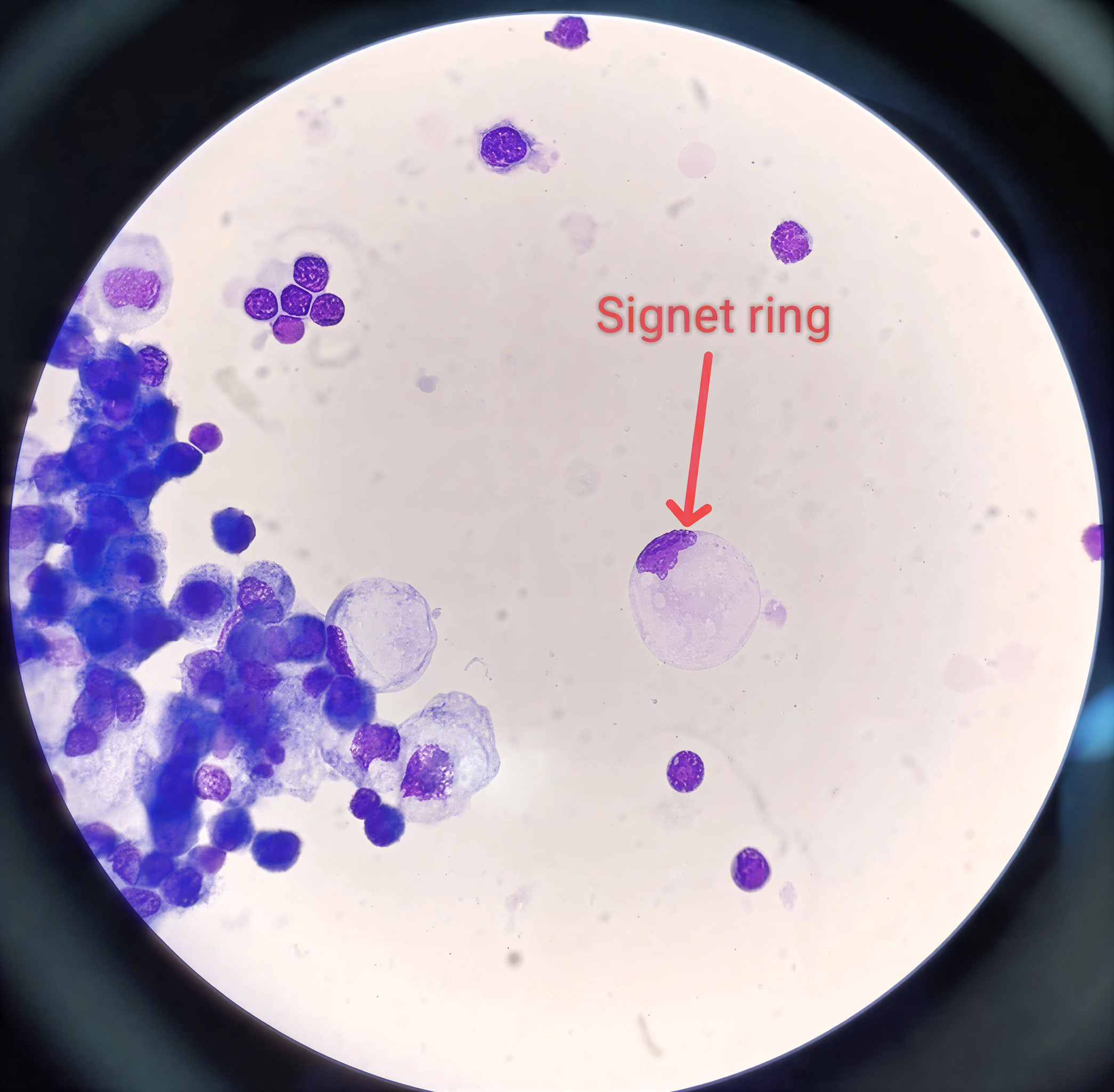 This gives the cell the appearance of a signet ring, where the nucleus looks like the “seal,” and the clear cytoplasm forms the ring shape.