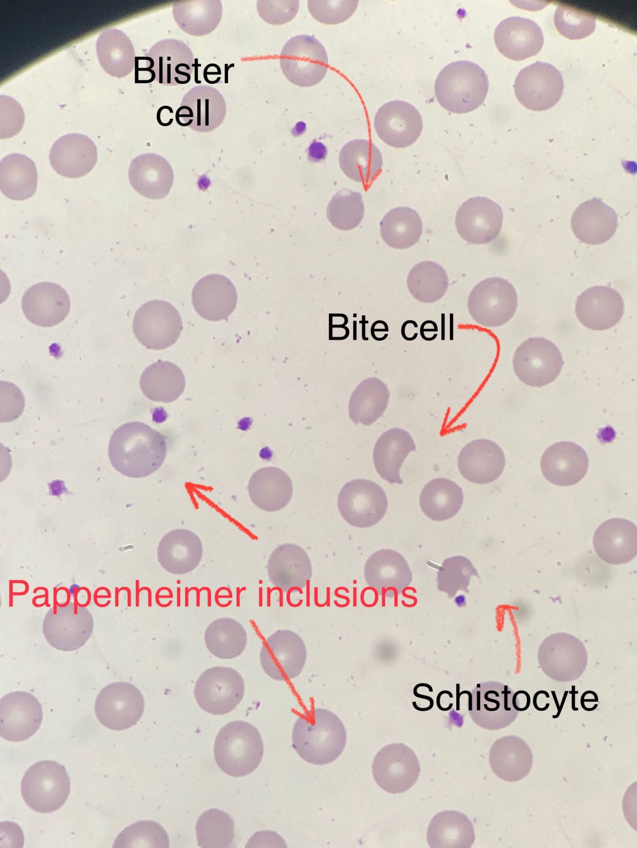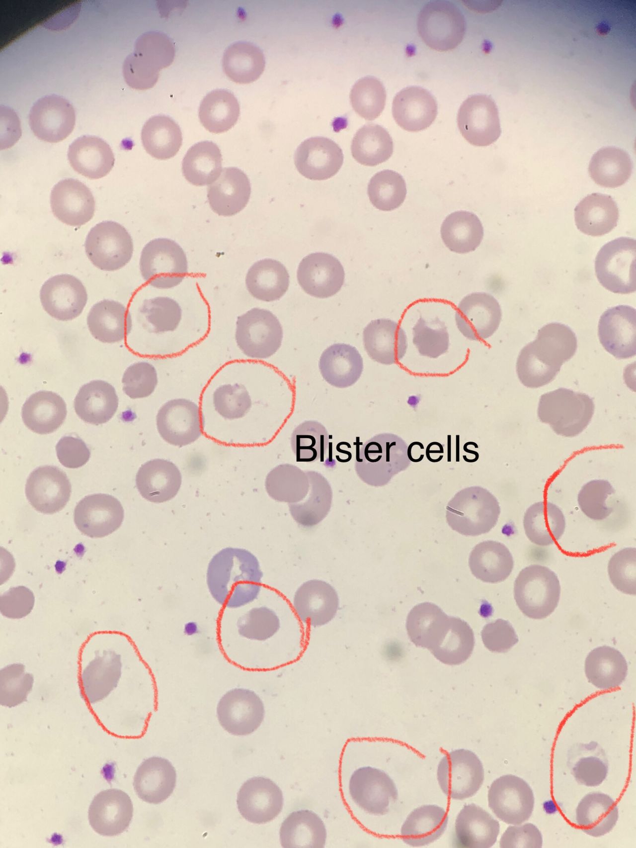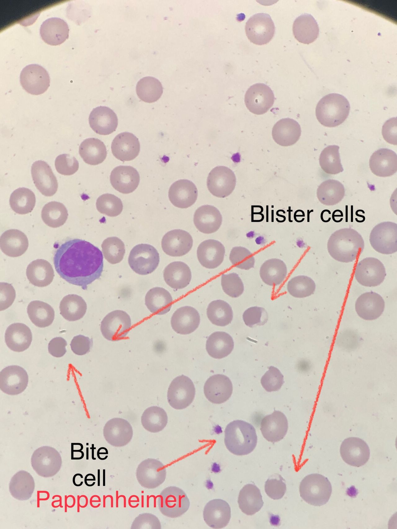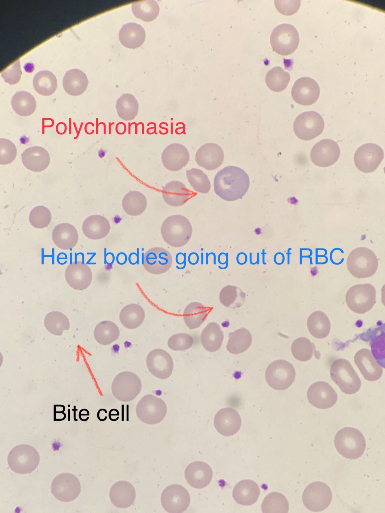 The slide really confirmed the hemolysis and high Retics he has . Polychromasia , Pappenheimer inclusions , Howell jolly bodies , Schistocytes , RBC fragments all seen . But then we have blister and bite cells , and amaizing some blisters are clear that Heinz bodies are going out of these RBCs , the leaving of Heinz bodies from inside will cause the shape of blister or bite cells when they go out and leave their place empty . So we did G6PD test and it was deficient even he is in hemolytic stage crisis . But the high MCV and as you can see Macrocytes and clear came from where ? Or from what ?