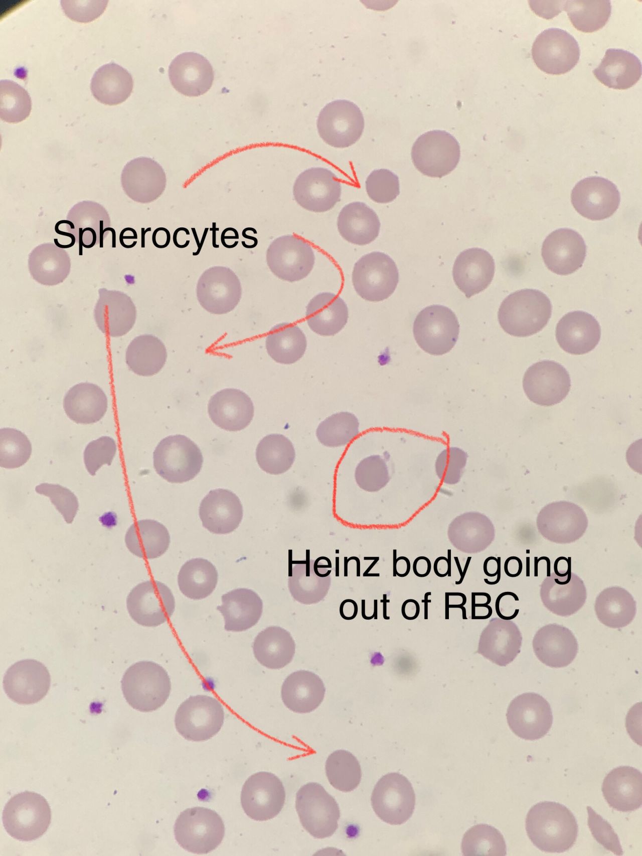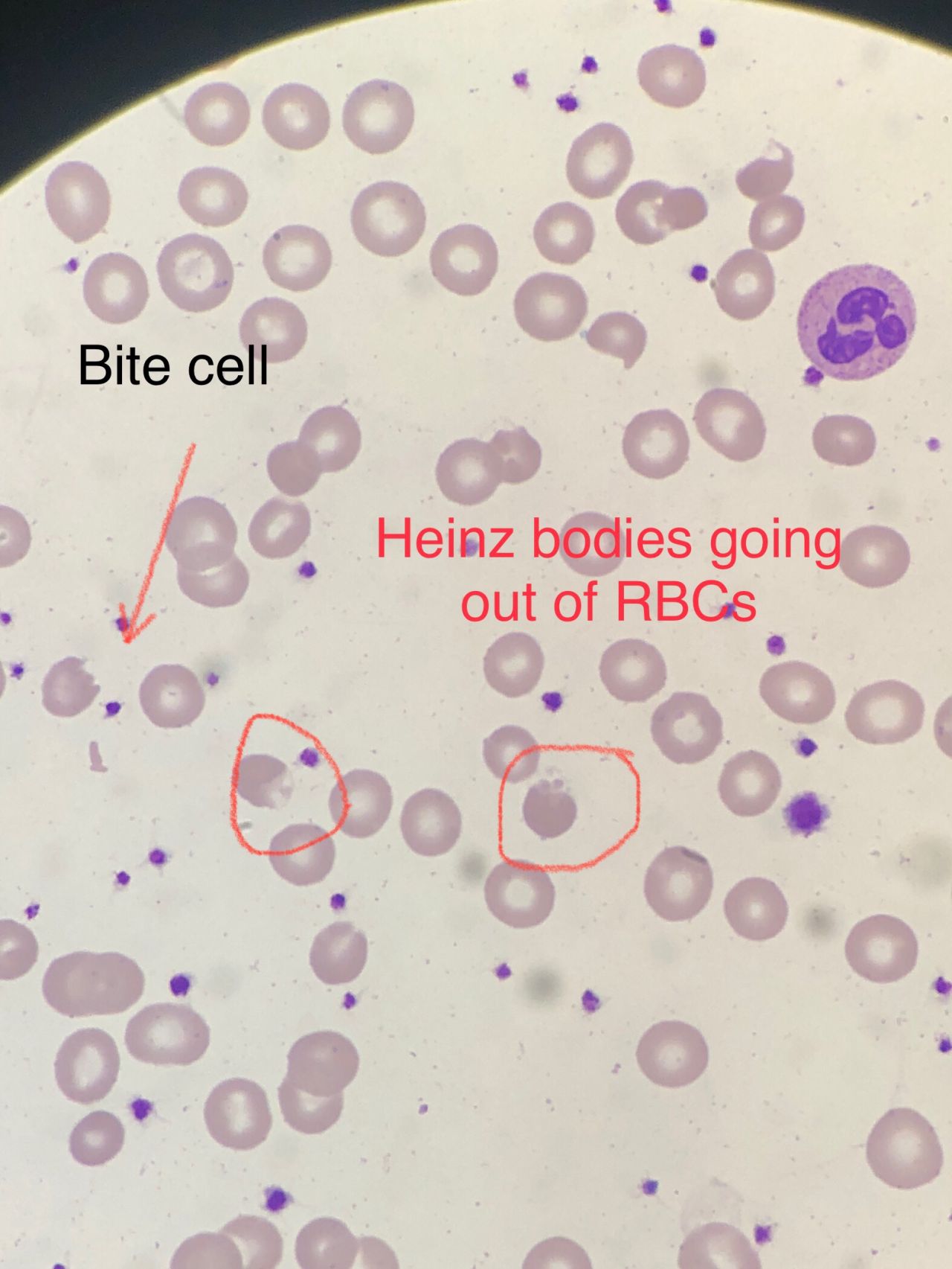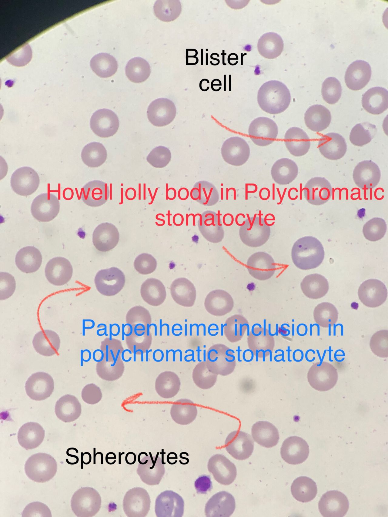The slide really confirmed the hemolysis and high Retics he has . Polychromasia , Pappenheimer inclusions , Howell jolly bodies , Schistocytes , RBC fragments all seen . But then we have blister and bite cells , and amaizing some blisters are clear that Heinz bodies are going out of these RBCs , the leaving of Heinz bodies from inside will cause the shape of blister or bite cells when they go out and leave their place empty . So we did G6PD test and it was deficient even he is in hemolytic stage crisis . But the high MCV and as you can see Macrocytes and clear came from where ? Or from what ?