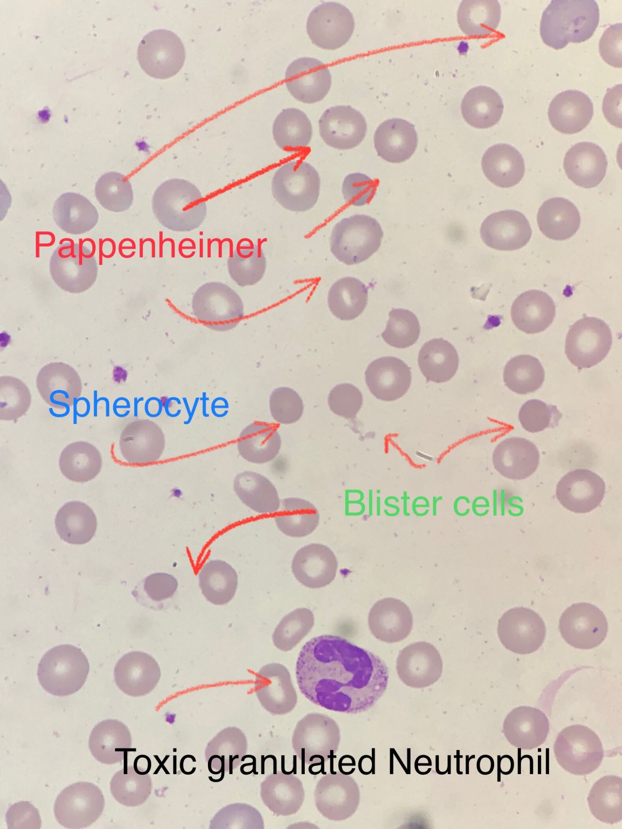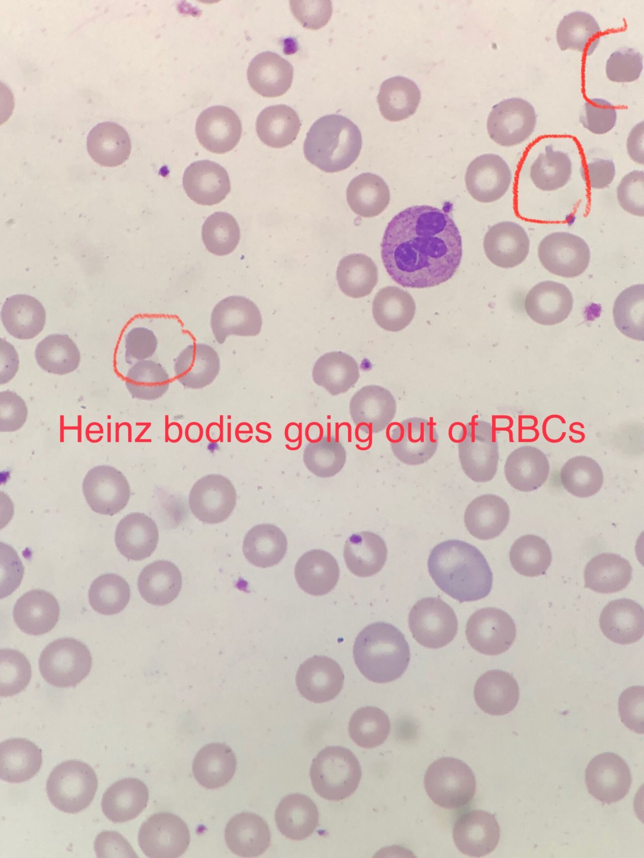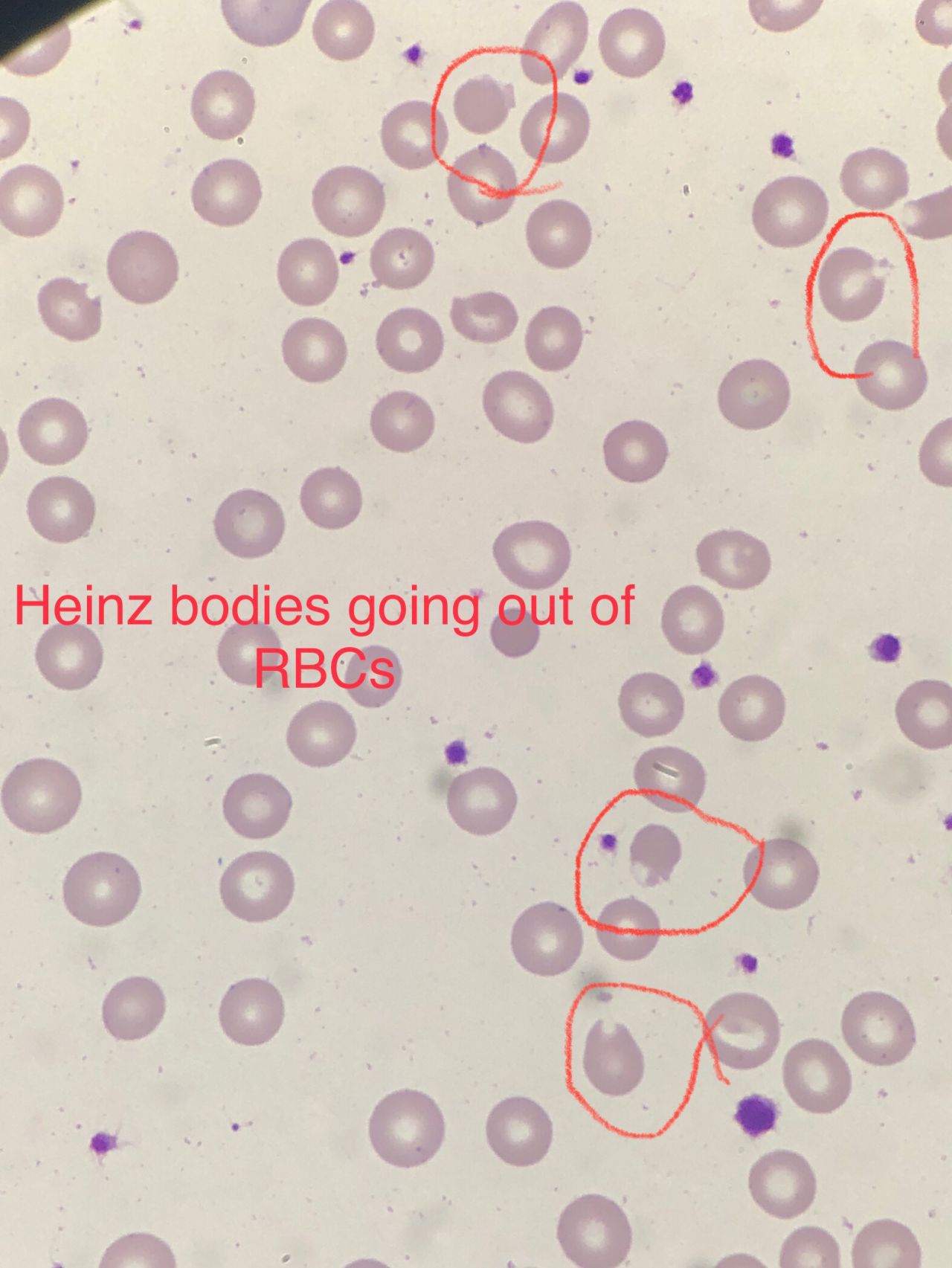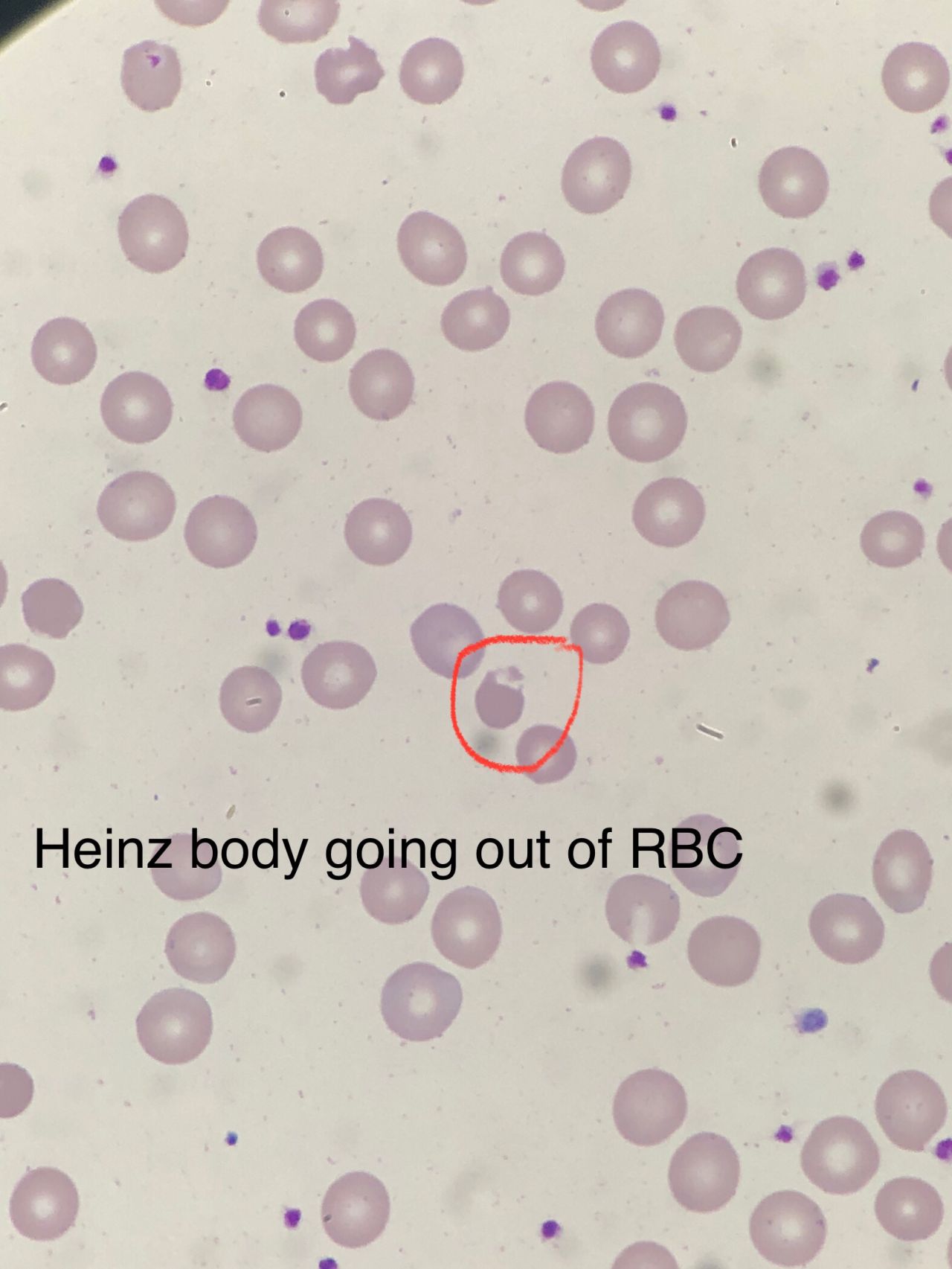 The slide really confirmed the hemolysis and high Retics he has . Polychromasia , Pappenheimer inclusions , Howell jolly bodies , Schistocytes , RBC fragments all seen . But then we have blister and bite cells , and amaizing some blisters are clear that Heinz bodies are going out of these RBCs , the leaving of Heinz bodies from inside will cause the shape of blister or bite cells when they go out and leave their place empty . So we did G6PD test and it was deficient even he is in hemolytic stage crisis . But the high MCV and as you can see Macrocytes and clear came from where ? Or from what ?