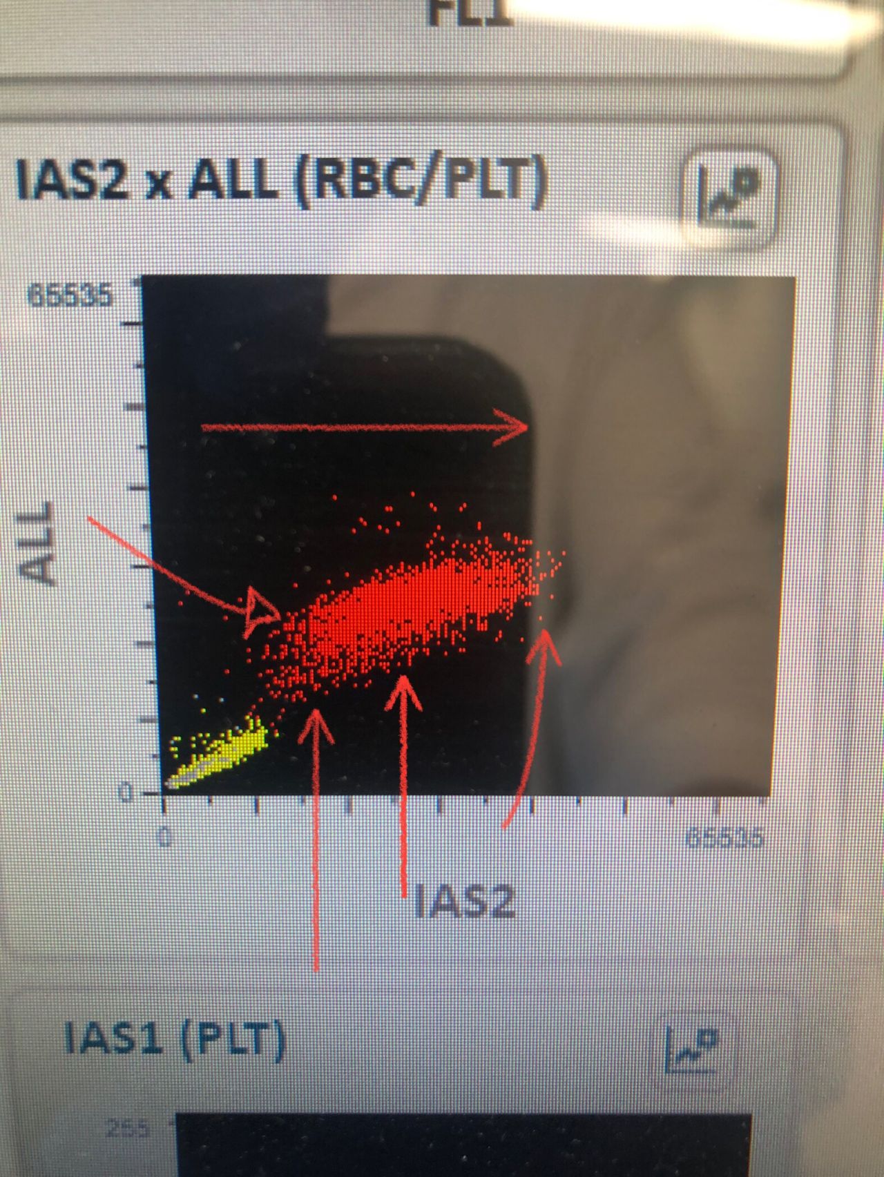 RBCs scatter shows 5 populations distributing from small to large in size confirming the high MCV really , also the RBC volume histogram shows the shift to right side , Macrocytosis