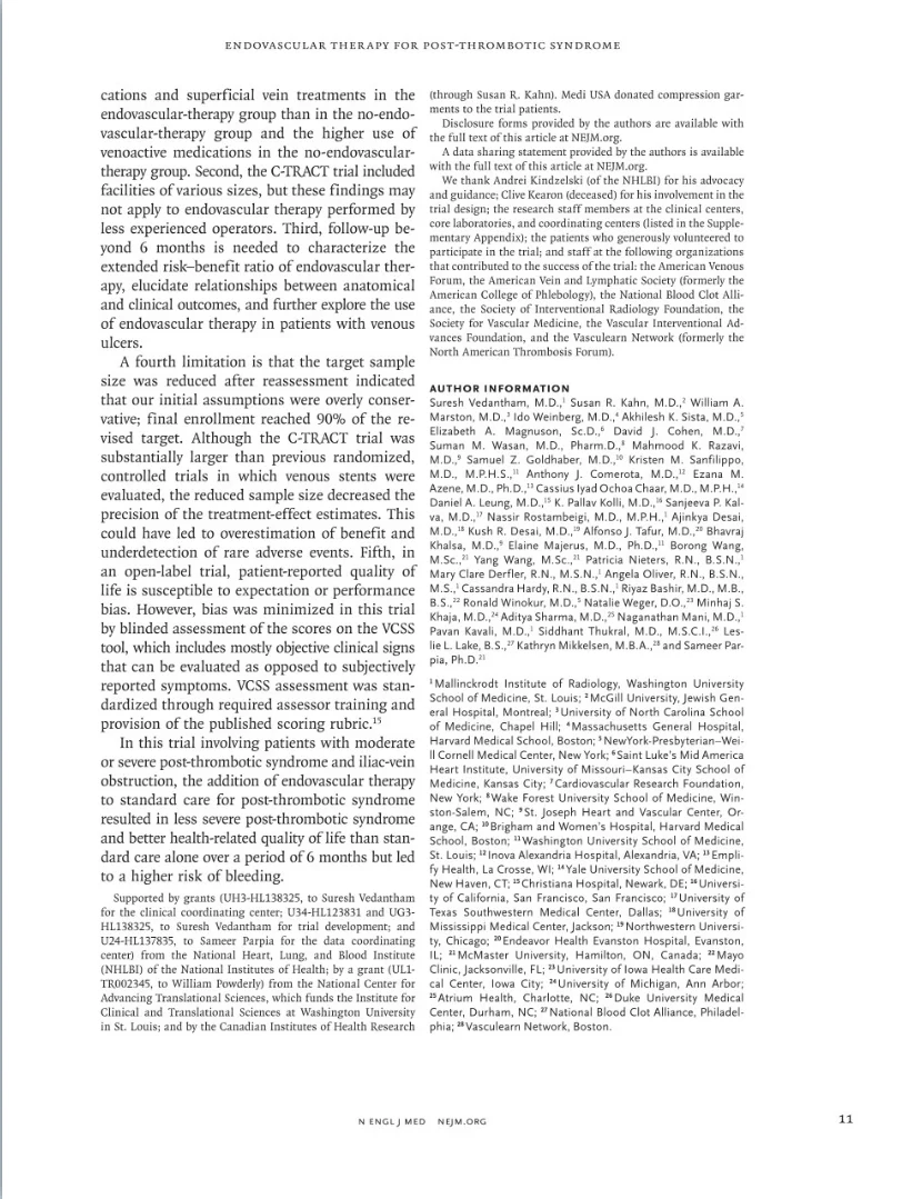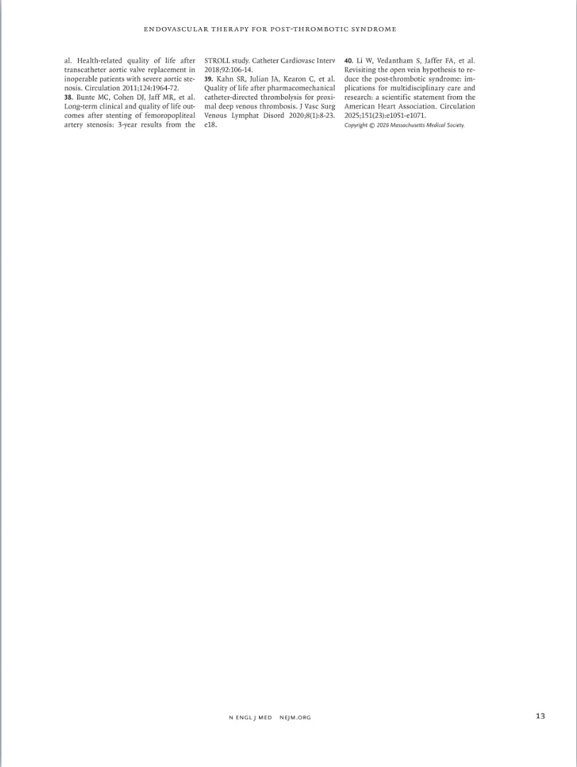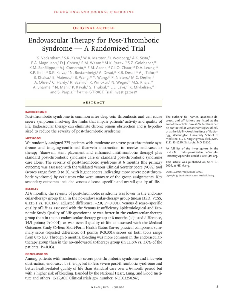 Authors: Suresh Vedantham, Susan R. Kahn, William A. Marston, Ido Weinberg, Akhilesh K. Sista, Elizabeth A. Magnuson, David J. Cohen, Suman M. Wasan, Mahmood K. Razavi, Samuel Z. Goldhaber, Kristen M. Sanfilippo, Anthony J. Comerota, Ezana M. Azene, Cassius Iyad Ochoa Chaar, Daniel A. Leung, K. Pallav Kolli, Sanjeeva P. Kalva, Nassir Rostambeigi, Ajinkya Desai, Kush R. Desai, Alfonso J. Tafur, Bhavraj Khalsa, Elaine Majerus, Borong Wang, Yang Wang, Patricia Nieters, Mary Clare Derfler, Angela Oliver, Cassandra Hardy, Riyaz Bashir, Ronald Winokur, Natalie Weger, Minhaj S. Khaja, Aditya Sharma, Naganathan Mani, Pavan Kavali, Siddhant Thukral, Leslie L. Lake, Kathryn Mikkelsen, Sameer Parpia