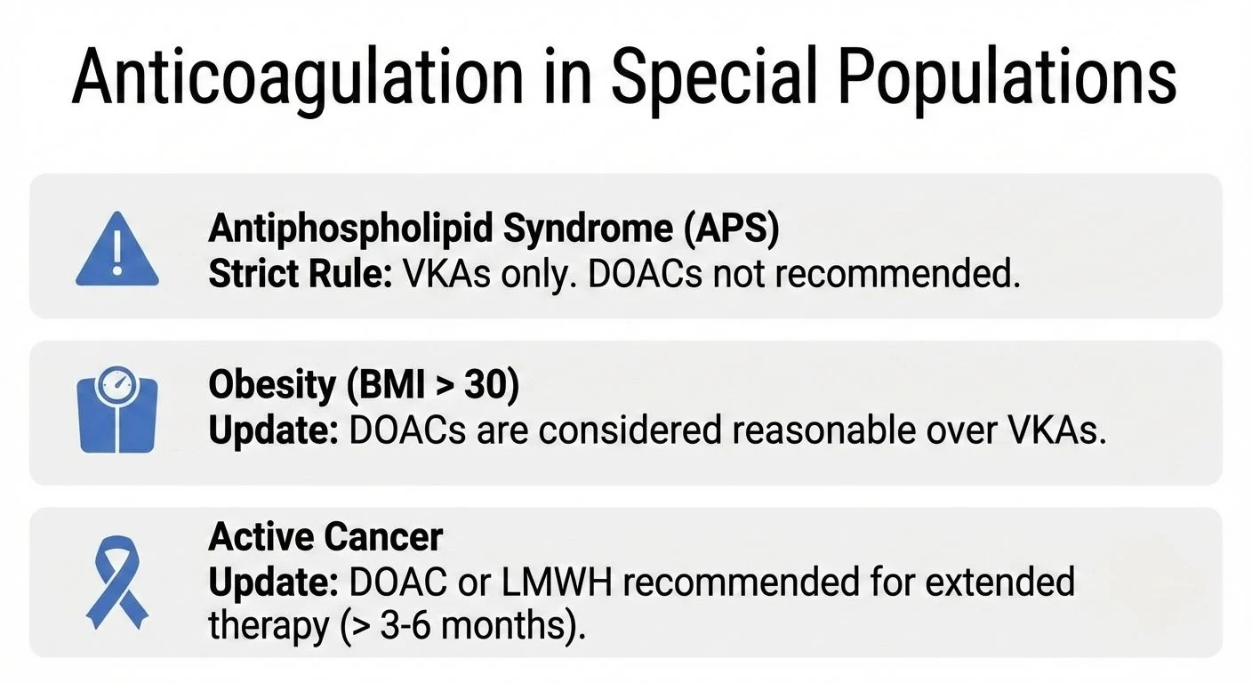 - Obesity and Cancer: DOACs are now considered reasonable over VKAs for obese patients (BMI >30) and are recommended alongside LMWH for extended cancer-associated thrombosis treatment.
