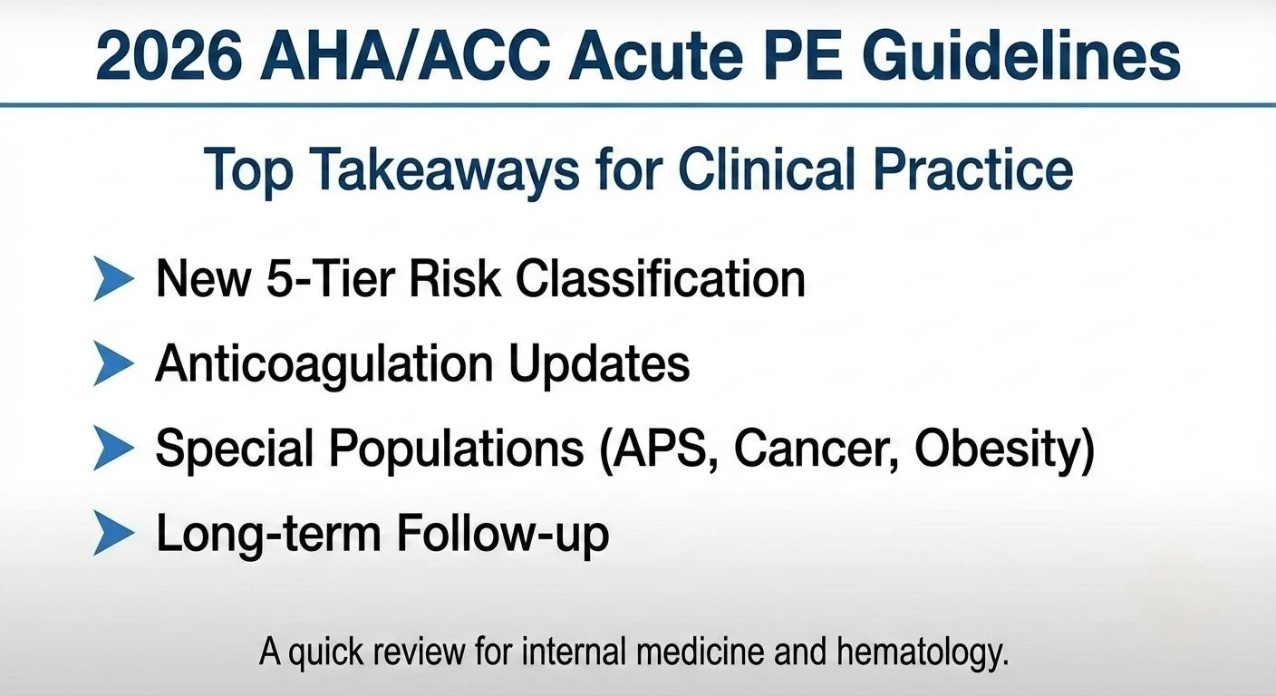 For my colleagues in Hematology, Internal Medicine, and Cardiology, the newly released 2026 AHA/ACC/ACCP/ACEP/CHEST/SCAI/SHM/SIR/SVM/SVN Guidelines for the Management of Acute Pulmonary Embolism introduce significant shifts that directly impact our daily clinical decision-making and patient protocols.