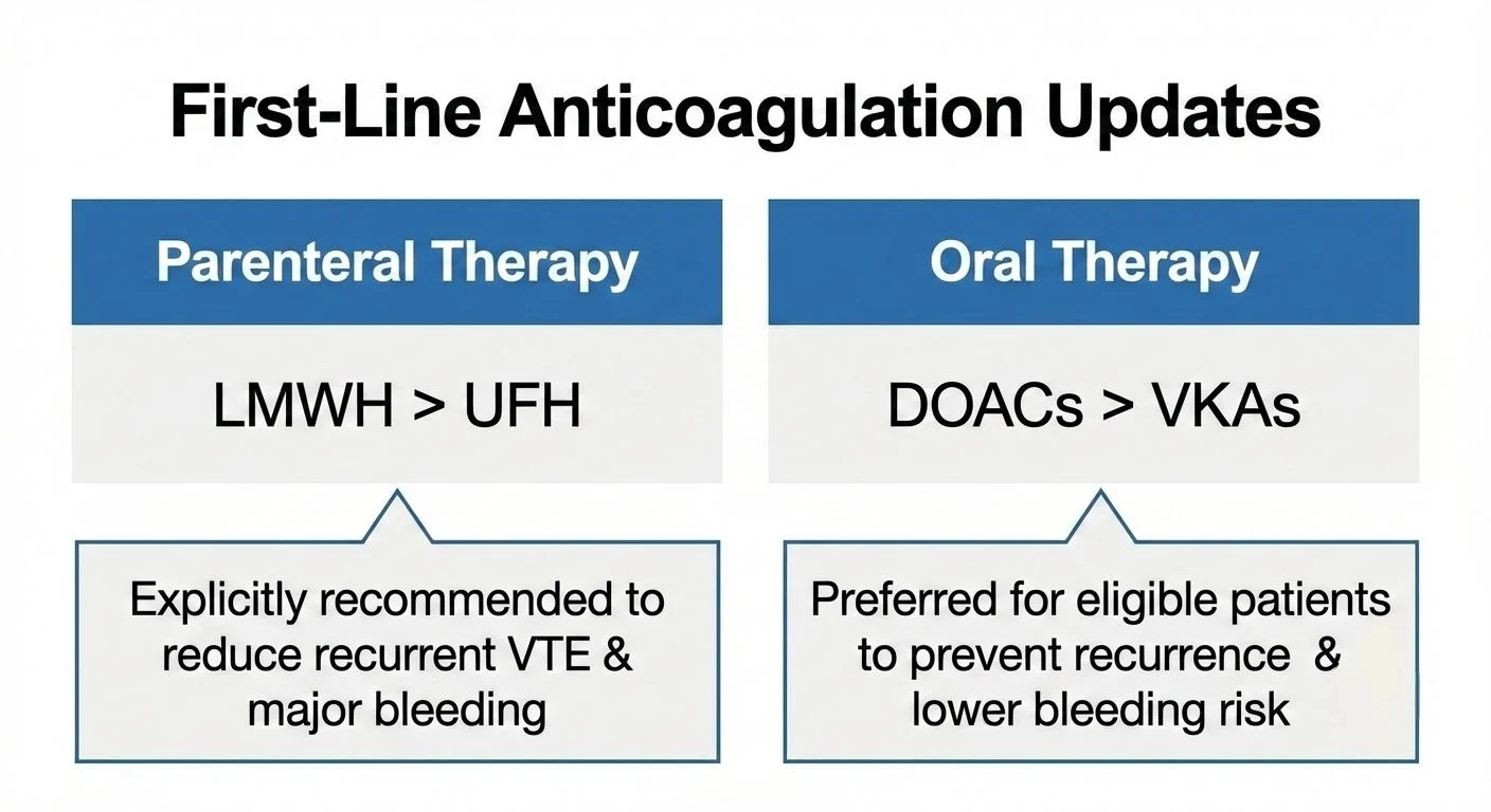 - Parenteral: When initial parenteral therapy is needed, Low-Molecular-Weight Heparin (LMWH) is explicitly recommended over UFH.