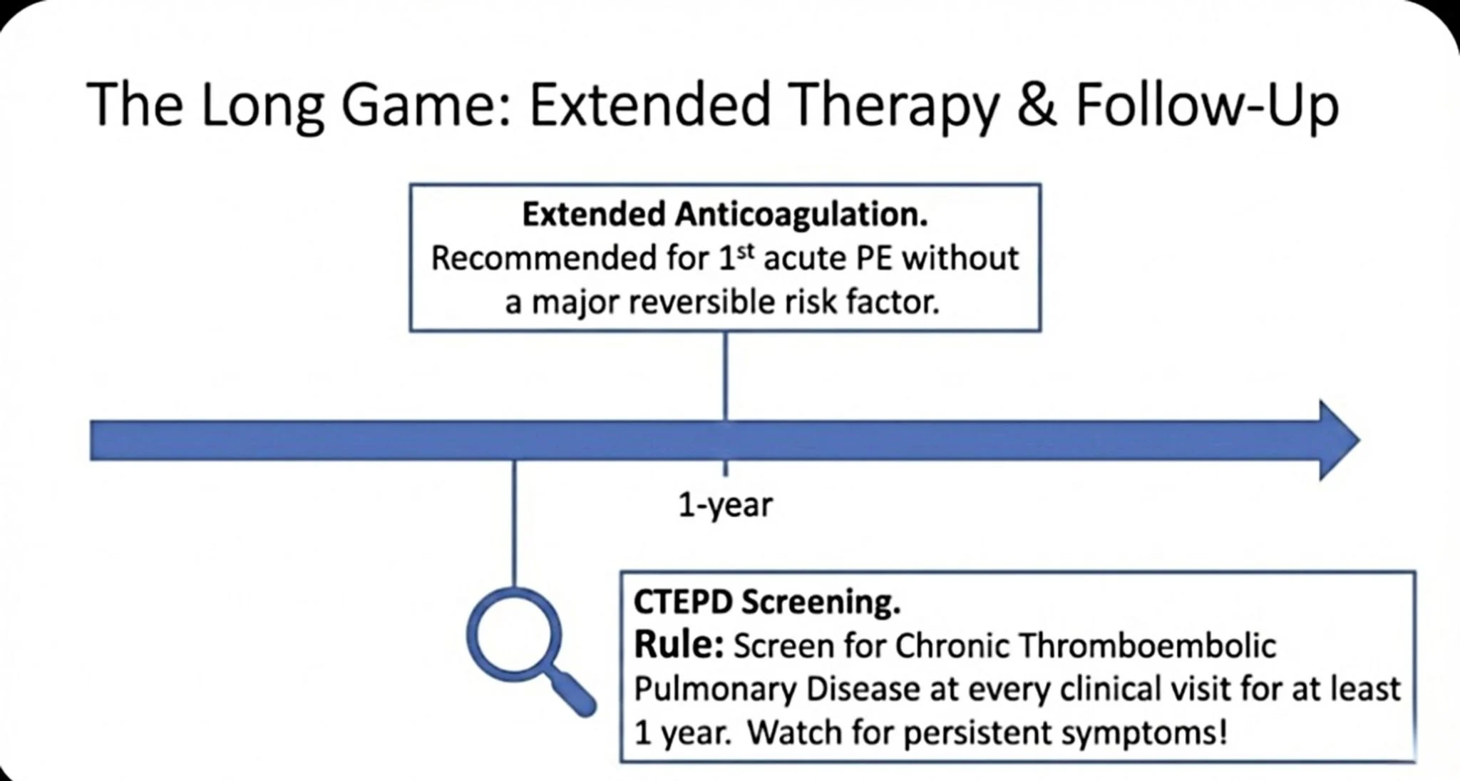 Crucially, we must screen for Chronic Thromboembolic Pulmonary Disease (CTEPD) at every clinical visit for at least one year post-PE.