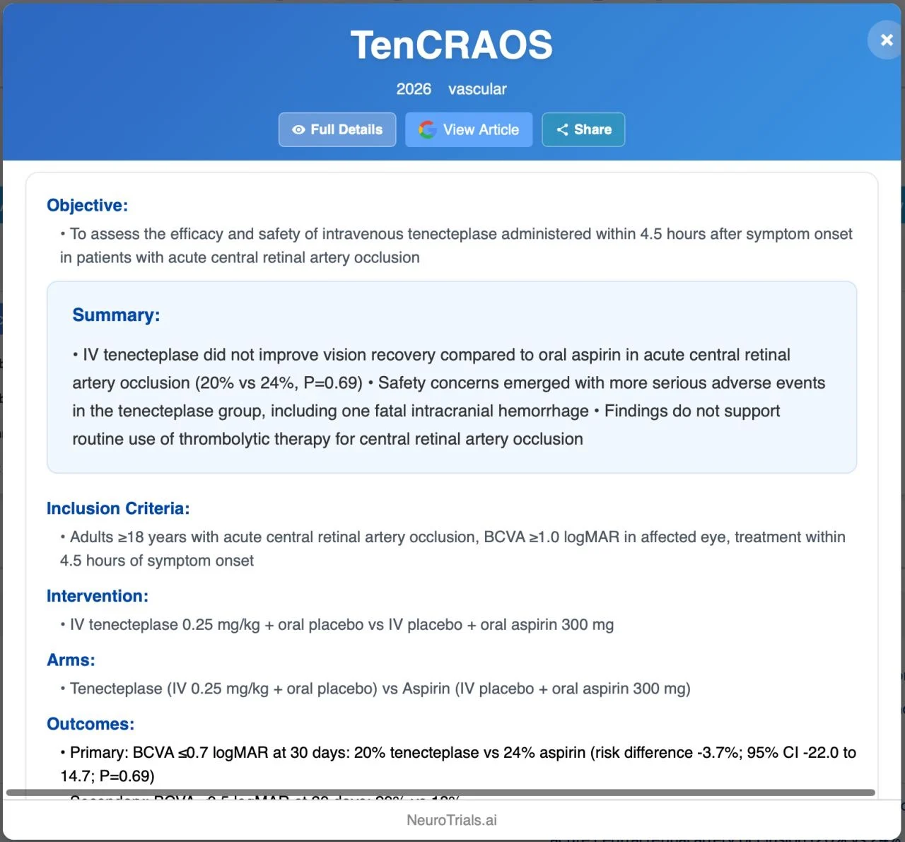TenCRAOS (2026) randomized 78 patients with acute CRAO to IV tenecteplase (0.25 mg/kg) vs aspirin within 4.5 hours.