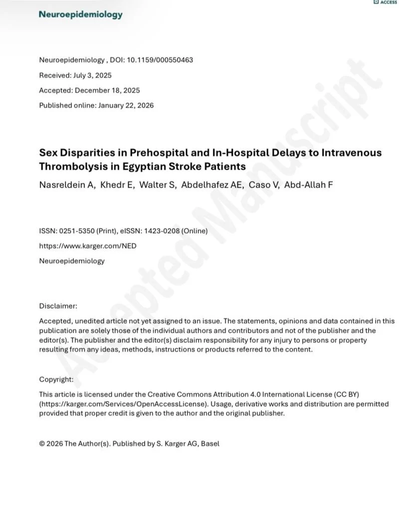 ”I’m happy to share that our manuscript on sex disparities in pre-hospital and in-hospital delays to intravenous thrombolysis in Egyptian acute ischemic stroke patients has been published in Neuroepiddmiology Journal