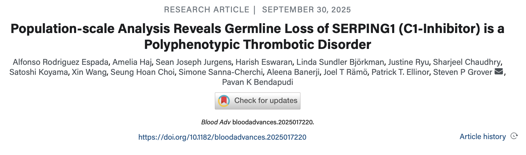 Article: Population-scale Analysis Reveals Germline Loss of SERPING1 (C1-Inhibitor) is a Polyphenotypic Thrombotic Disorder