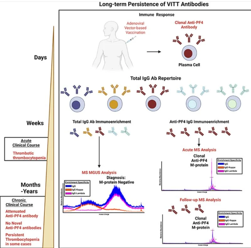 - While VITT anti-PF4 antibodies are clonally restricted, the monoclone/oligoclones are not evident upon study of the entire IgG repertoire, and require anti-PF4 antibody isolation to appreciate clonal restriction. This is in contrast to MGTS where a monoclonal antibody is clearly seen by SPEP/IFE/Mass-Fix.