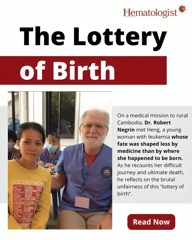 ”On a medical mission to rural Cambodia, ASH President Robert Negrin met Heng, a young woman with leukemia whose fate was shaped less by medicine than by where she happened to be born. While he raised funds to support her treatment and connect her with care in Bangkok, none of his efforts could ultimately help Heng overcome the brutal unfairness of the ‘lottery of birth.’