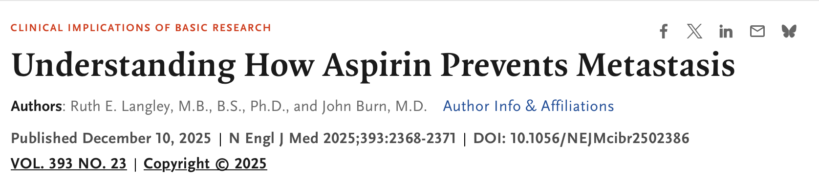 Learn more in the Clinical Implications of Basic Research article “Understanding How Aspirin Prevents Metastasis” by Ruth E. Langley, MB, BS, PhD, and John Burn, MD, from UCL and Newcastle University.”