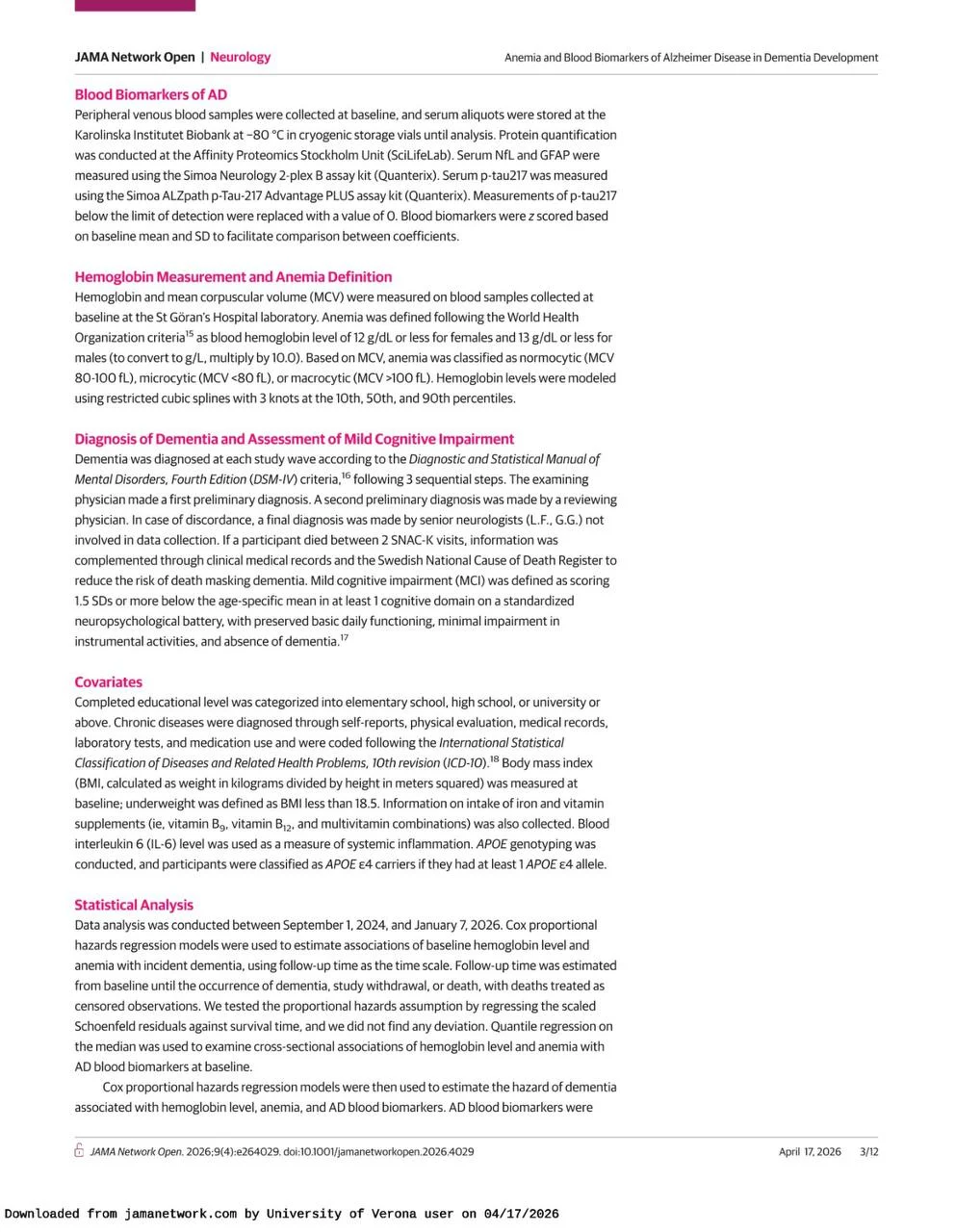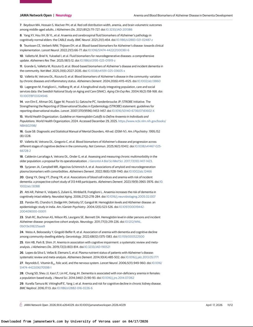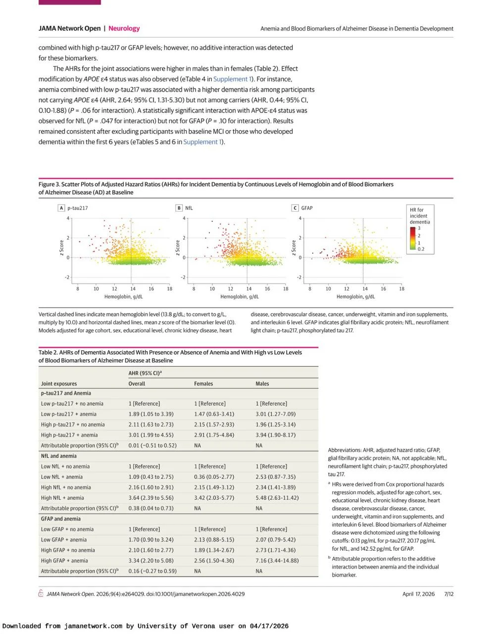 Title: Anemia and Blood Biomarkers of Alzheimer Disease in Dementia Development