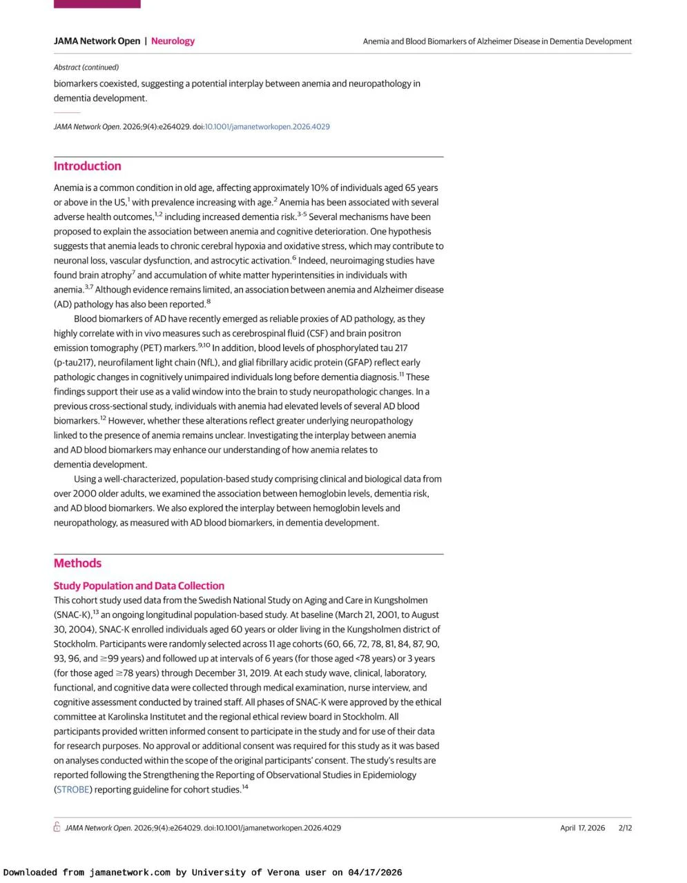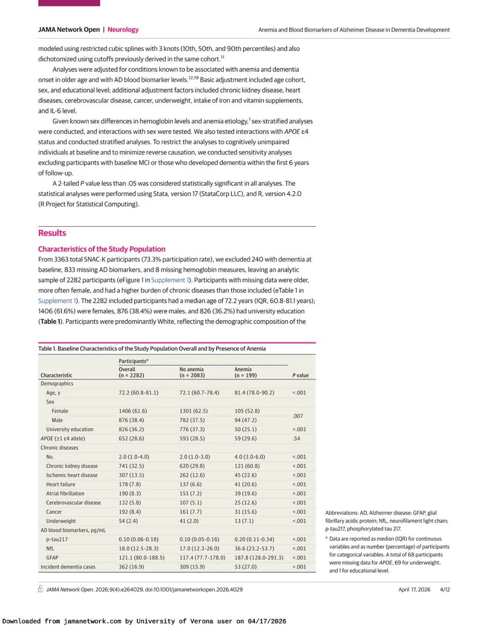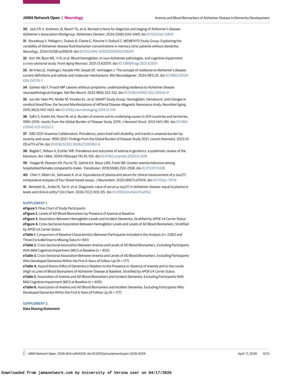 Title: Anemia and Blood Biomarkers of Alzheimer Disease in Dementia Development