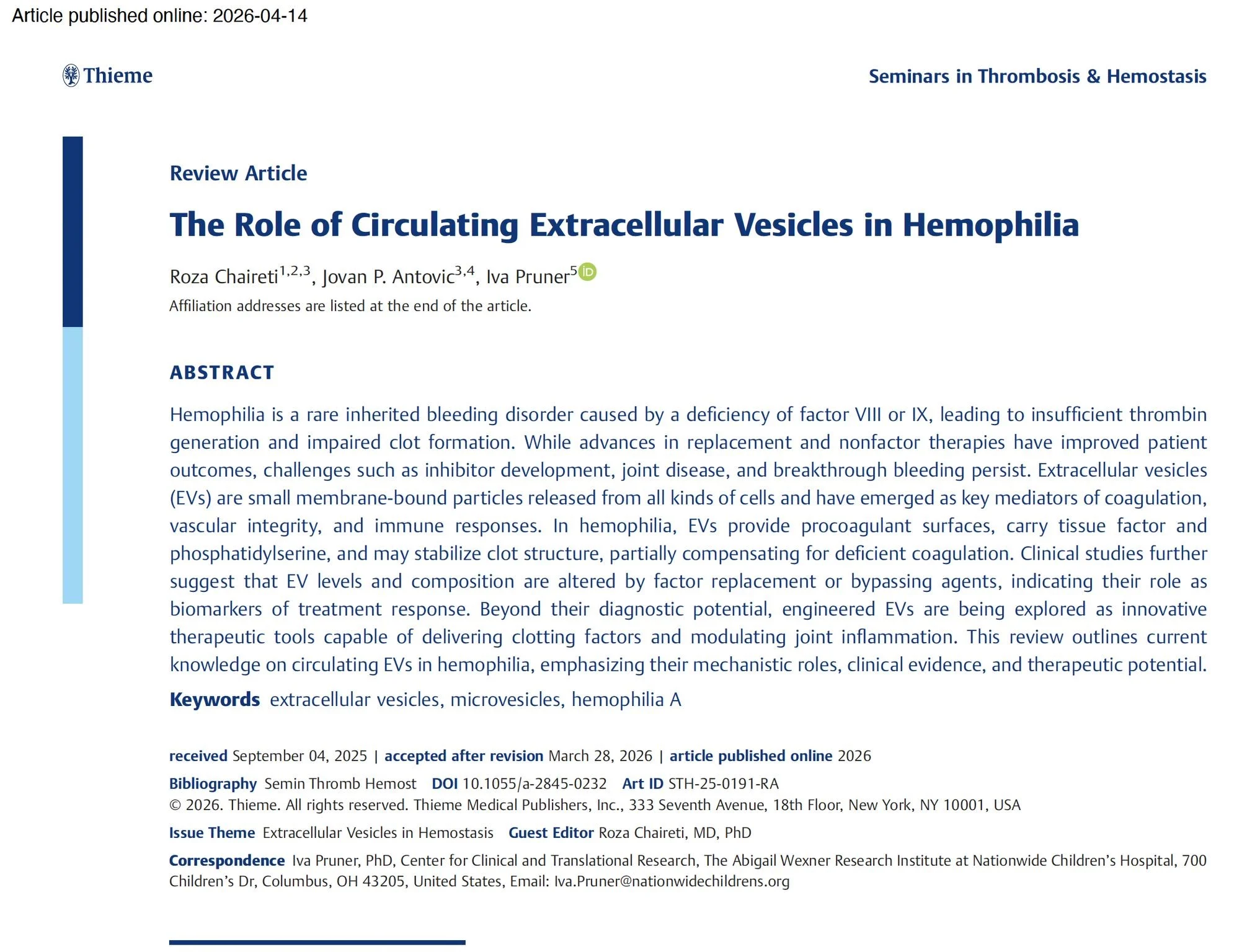 Title: The Role of Circulating Extracellular Vesicles in Hemophilia
