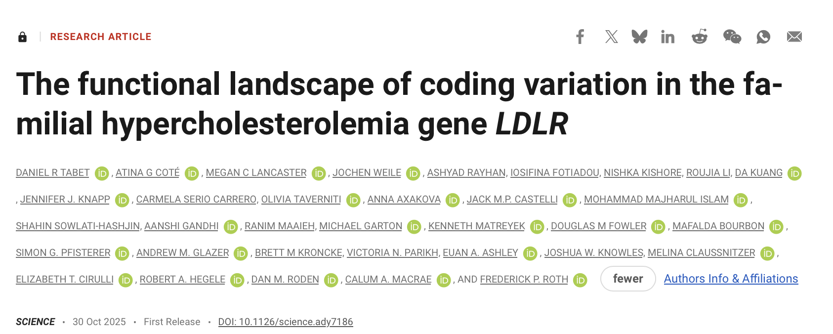 ”So excited about this new work from our CardioVar consortium out this week in Science Magazine led by the amazing Daniel Tabet, and Fritz Roth.