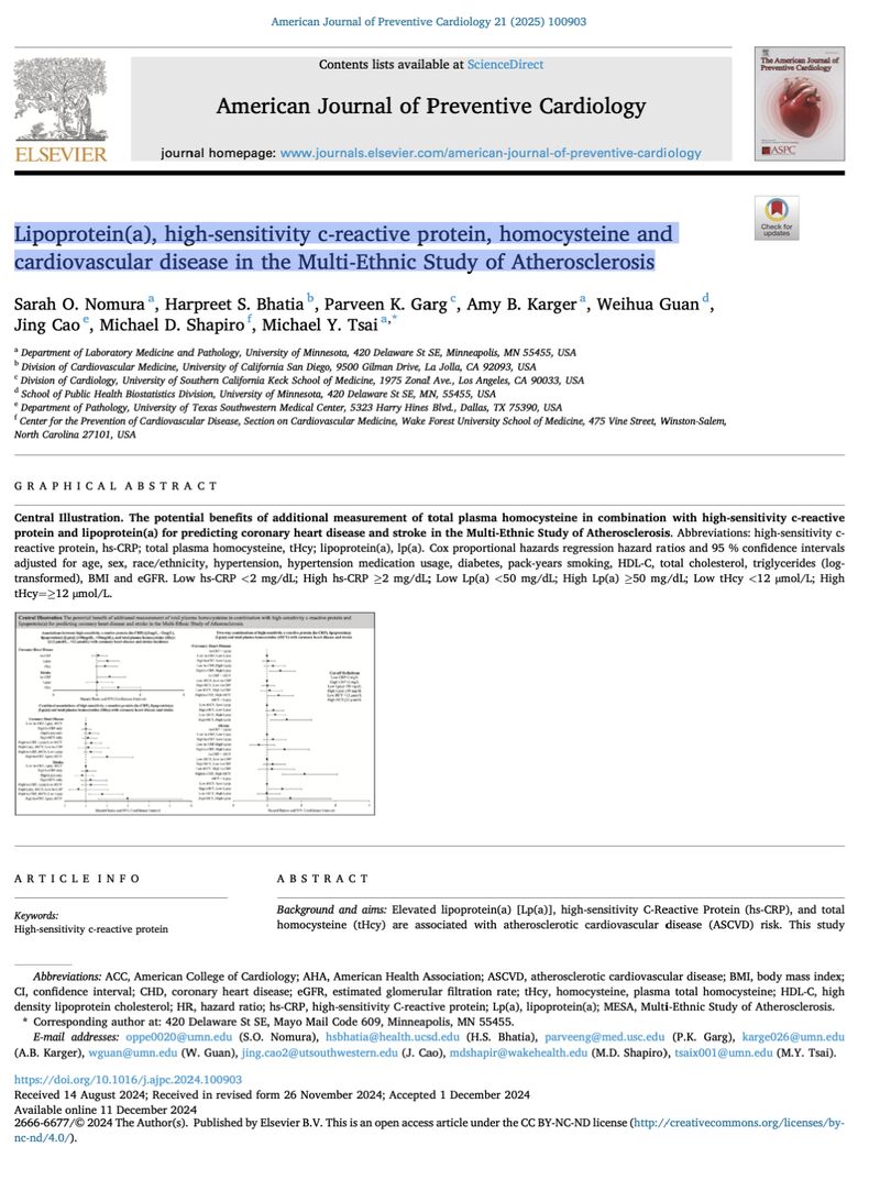 Article: Lipoprotein(a), high-sensitivity c-reactive protein, homocysteine and cardiovascular disease in the Multi-Ethnic Study of Atherosclerosis