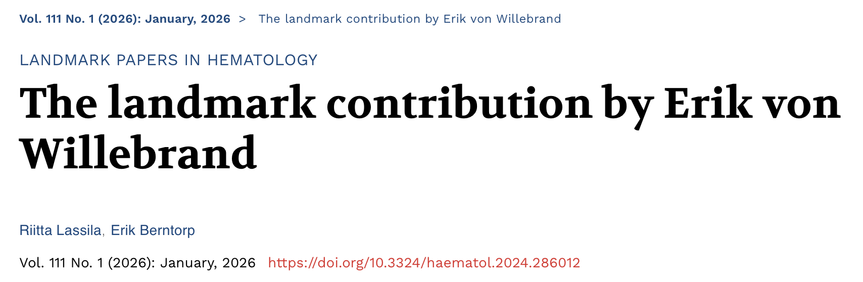 ”Landmark paper in Hematology: One hundred years ago the Finnish physician Erik Adolf von Willebrand published his landmark paper on hereditary pseudohemophilia in Documents of the Finnish Society of Medicine: he had discovered the disease that nowadays we universally known by his name.”