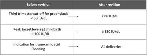 • Higher third-trimester thresholds for initiating prophylaxis (<80 IU/dL vs <50 IU/dL)