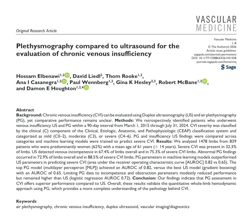 A quantitative, whole – limb hemodynamic assessment with PG may better stratify CVI severity – and improve prognostic insight – than ultrasound alone.”