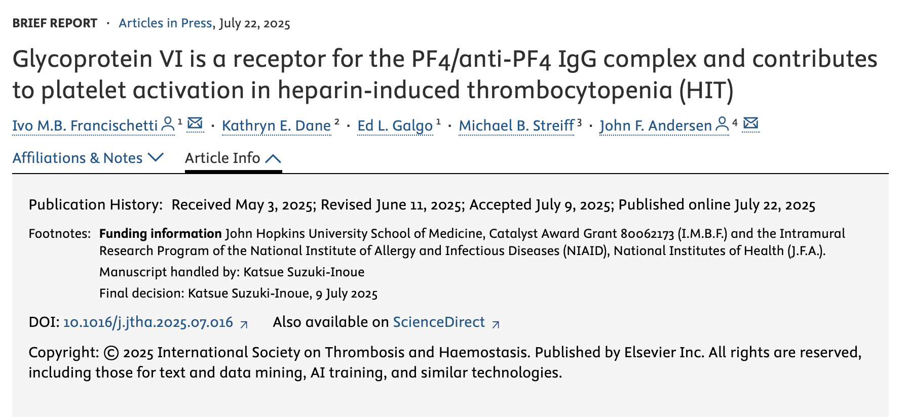 Ivo Francischetti and Colleagues on Glycoprotein VI Contributing to Platelet Activation in HIT