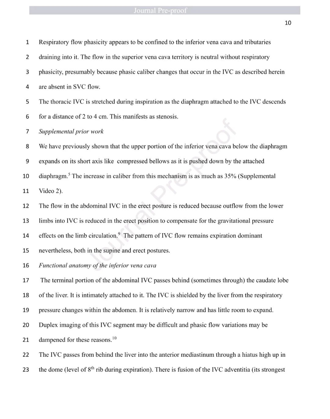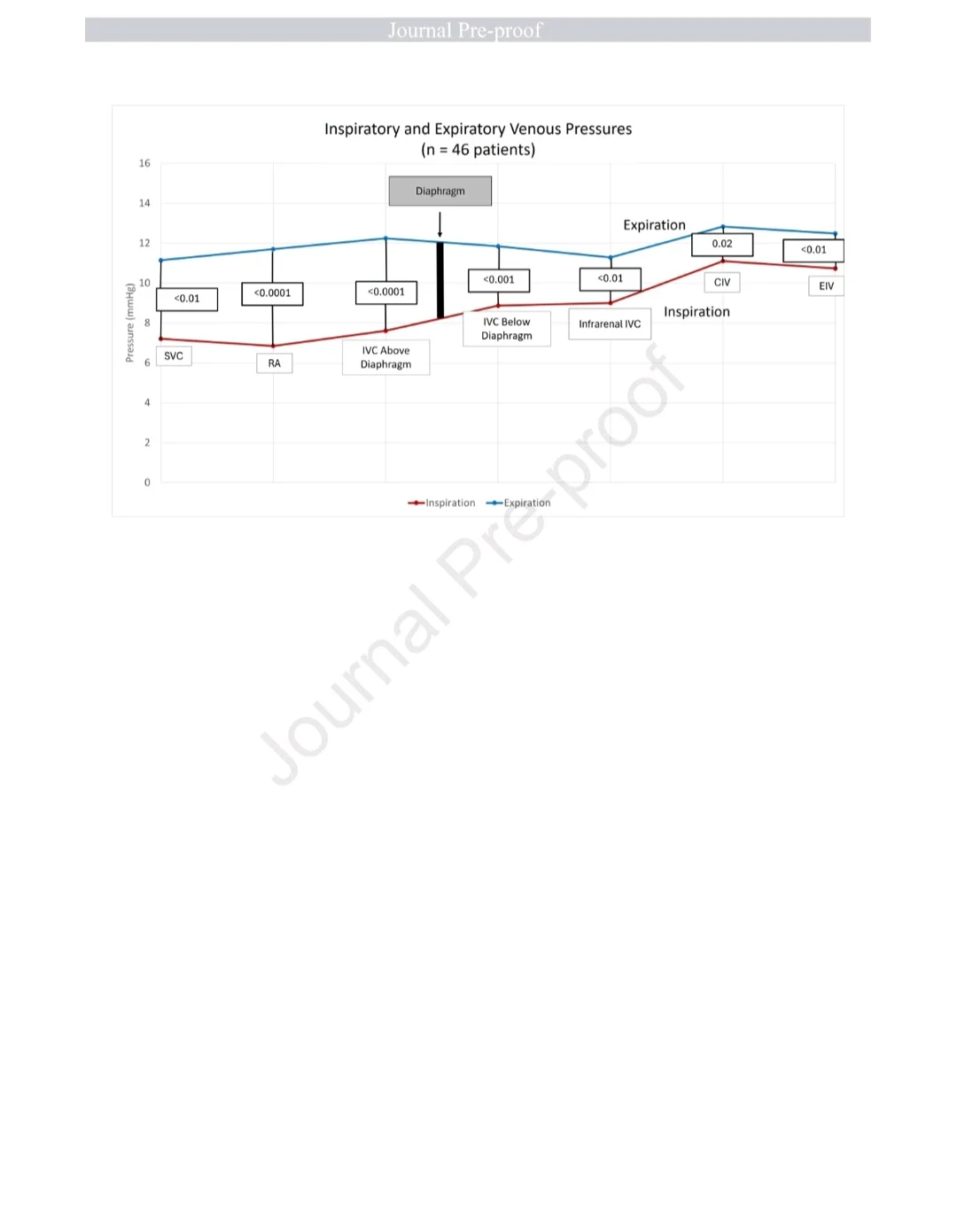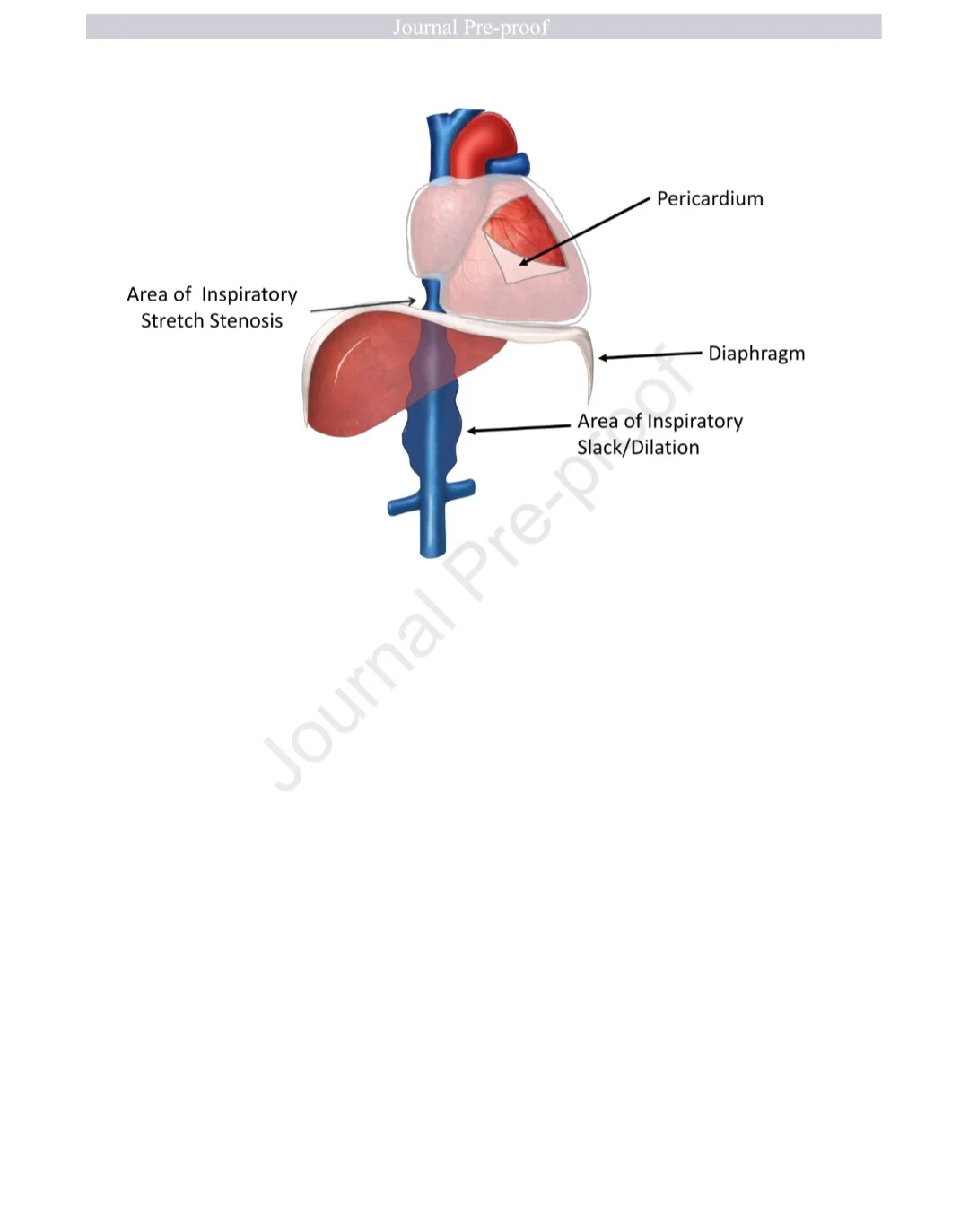 - The short thoracic IVC stenoses with inspiration (approximately 30% diameter reduction, sometimes near‑collapse), while the suprarenal abdominal IVC dilates by approximately 35% on IVUS – so much for the classic ‘abdominal pump’