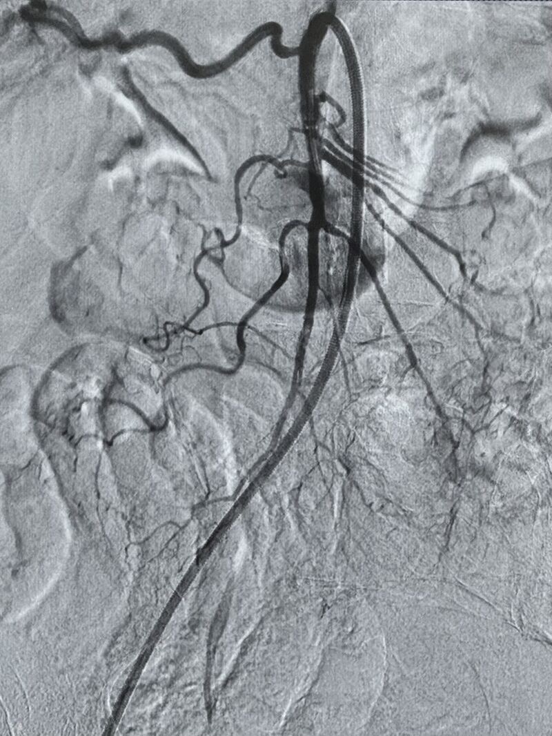 The final angiographic control demonstrated complete recanalization of the previously occluded artery, with opacification of all colic and jejunal vascular branches.