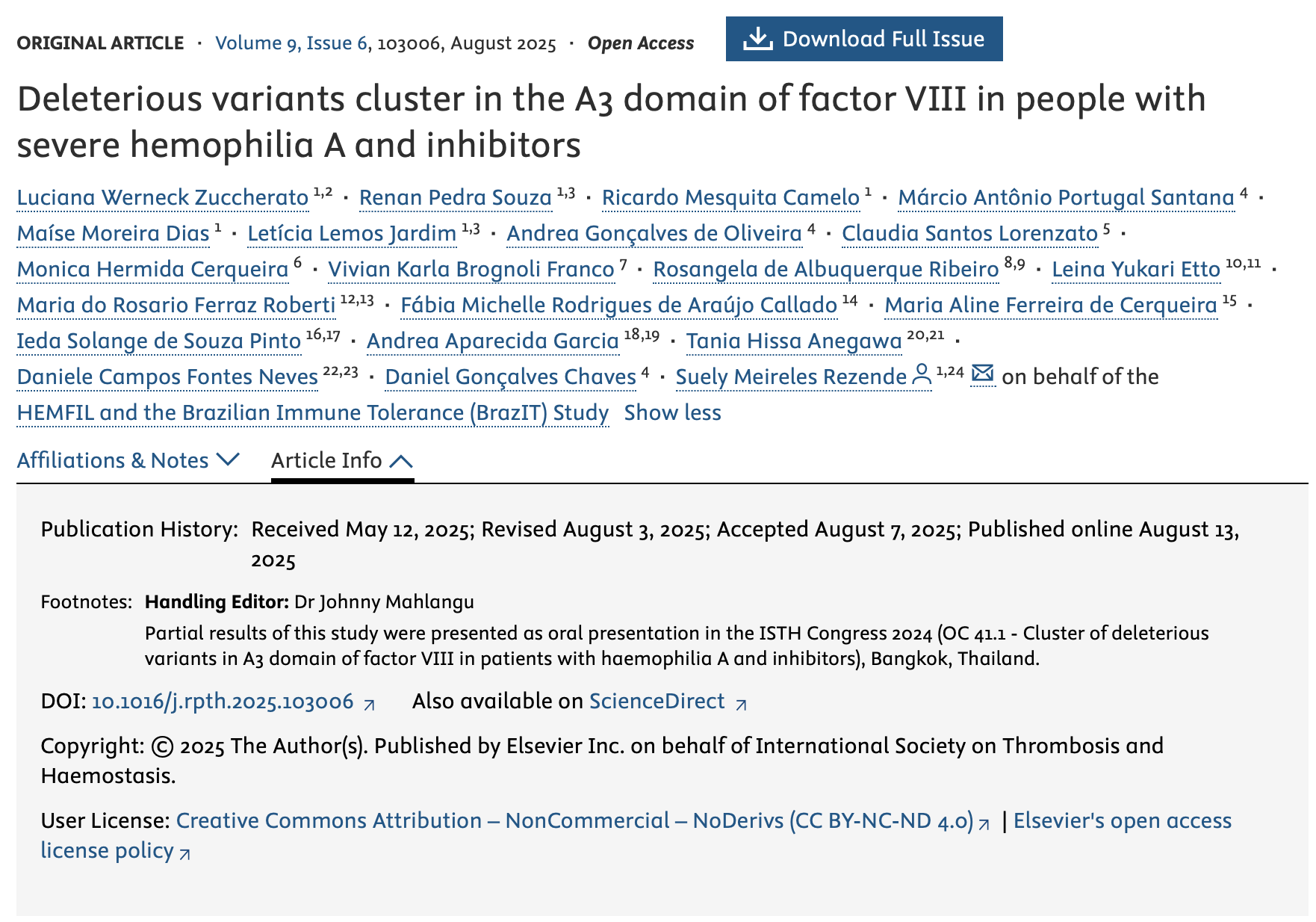 Oct 18, 2025, 16:25Luciana Werneck Zuccherato and Colleagues on A3 domain of FVIII in Severe Hemophilia A