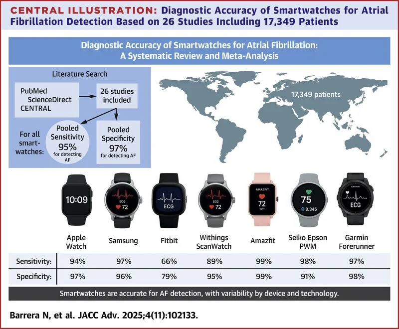 Atrial fibrillation (AF) is the most prevalent arrhythmia and a significant risk factor for stroke and heart disease, making early diagnosis crucial for prevention. Although several smartwatches can detect AF, their accuracy varies, and there is limited information regarding their effectiveness.