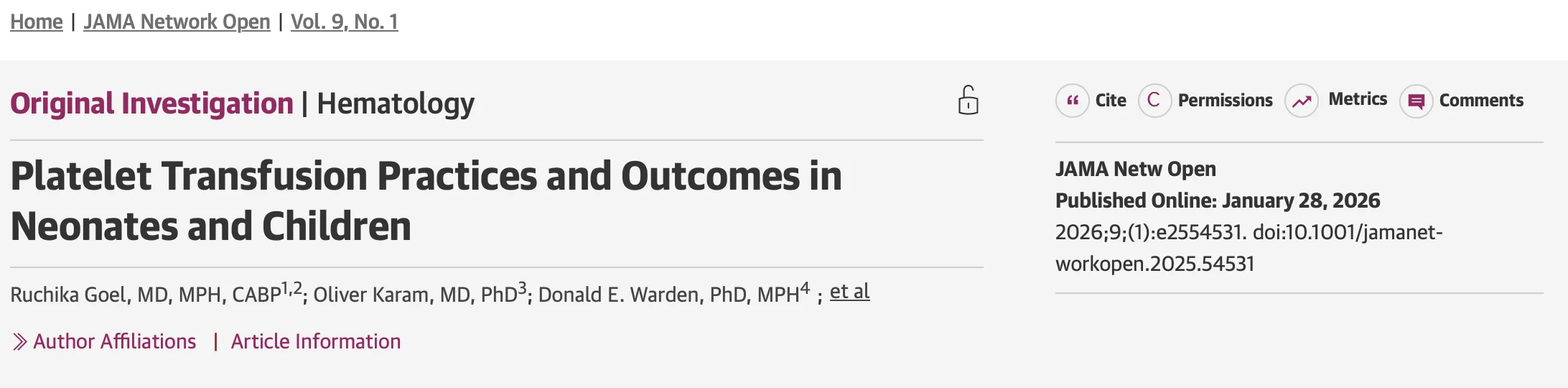 ”Congratulations to Dr Ruchika Goel and colleagues for their paper on pediatric transfusion in JAMA Open Network.