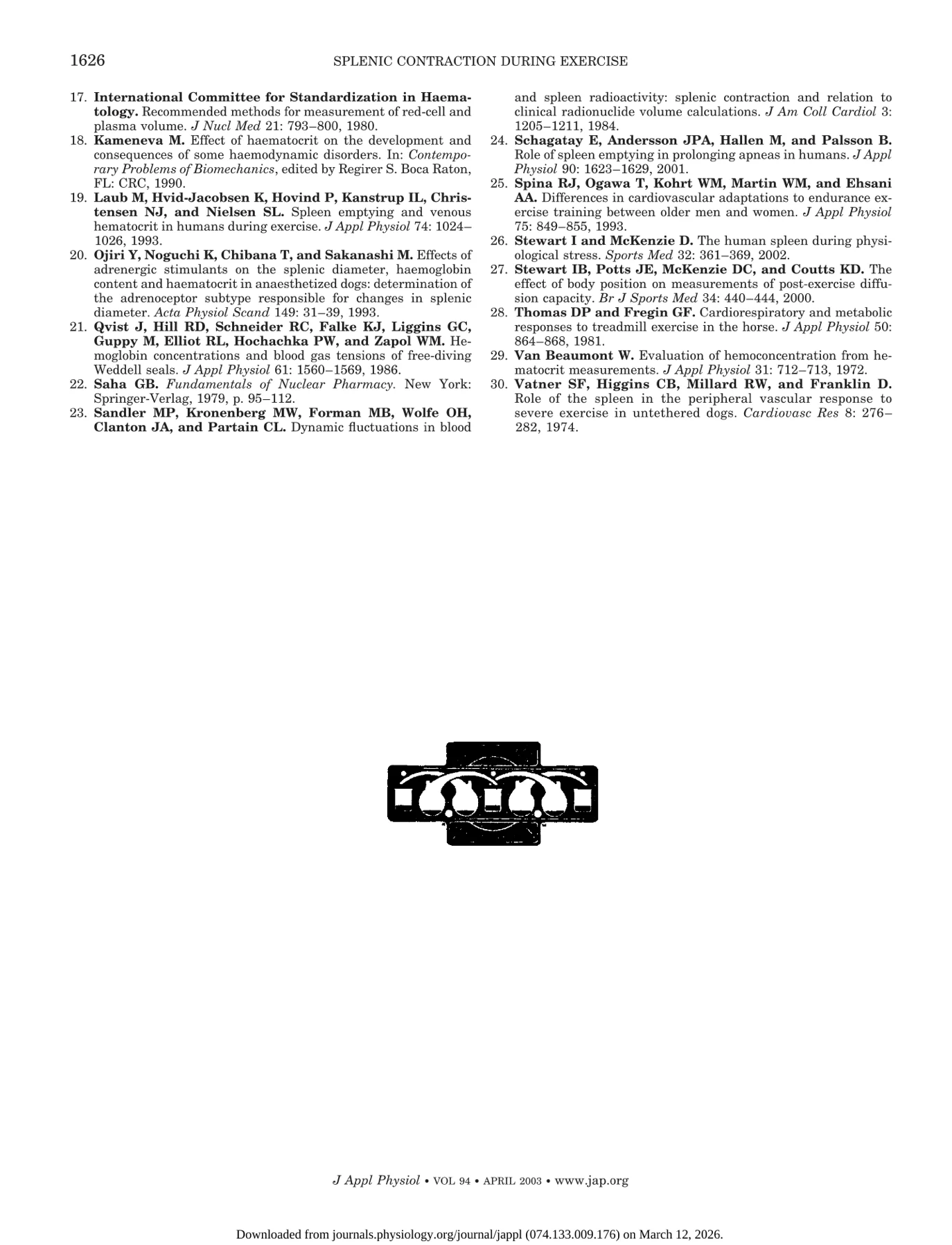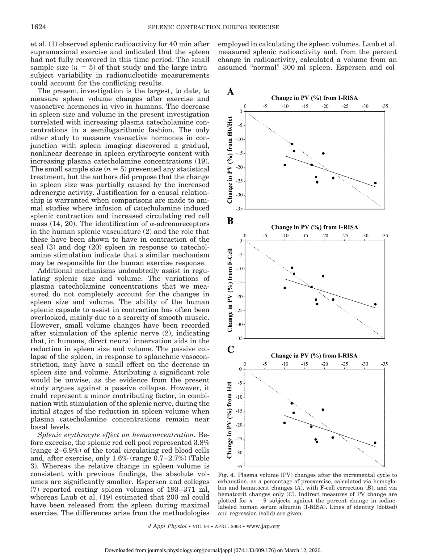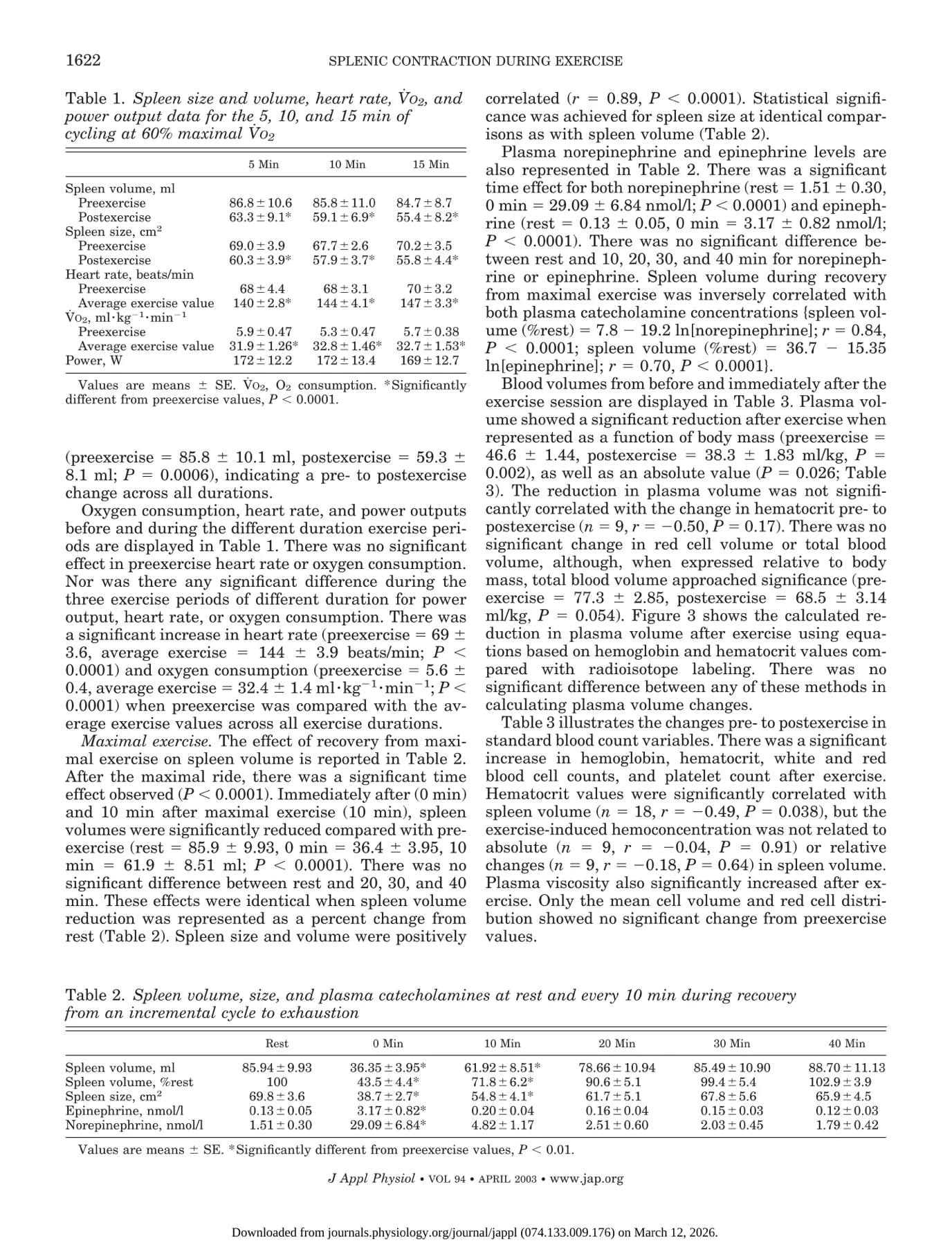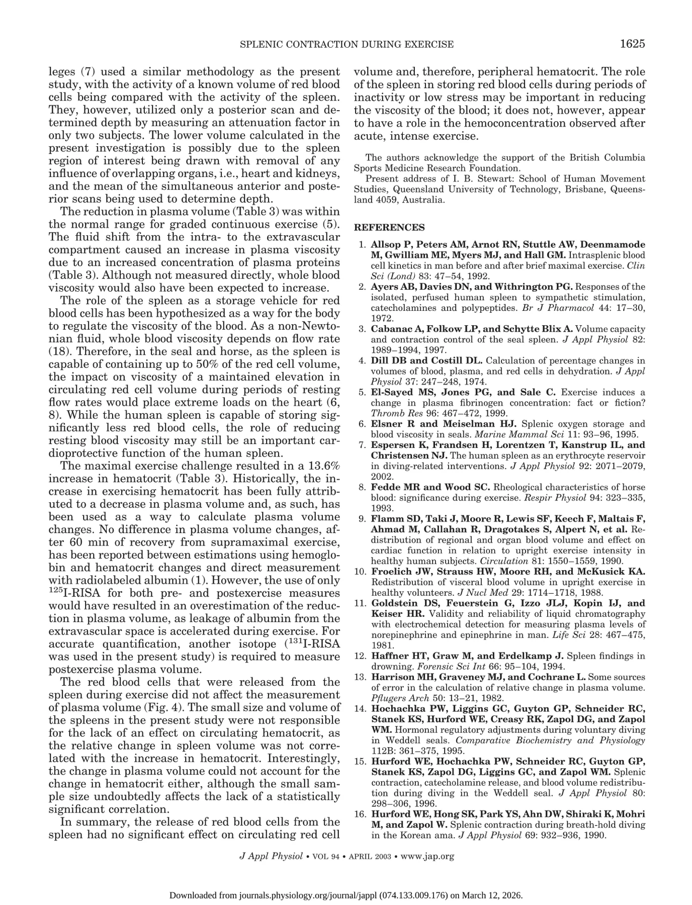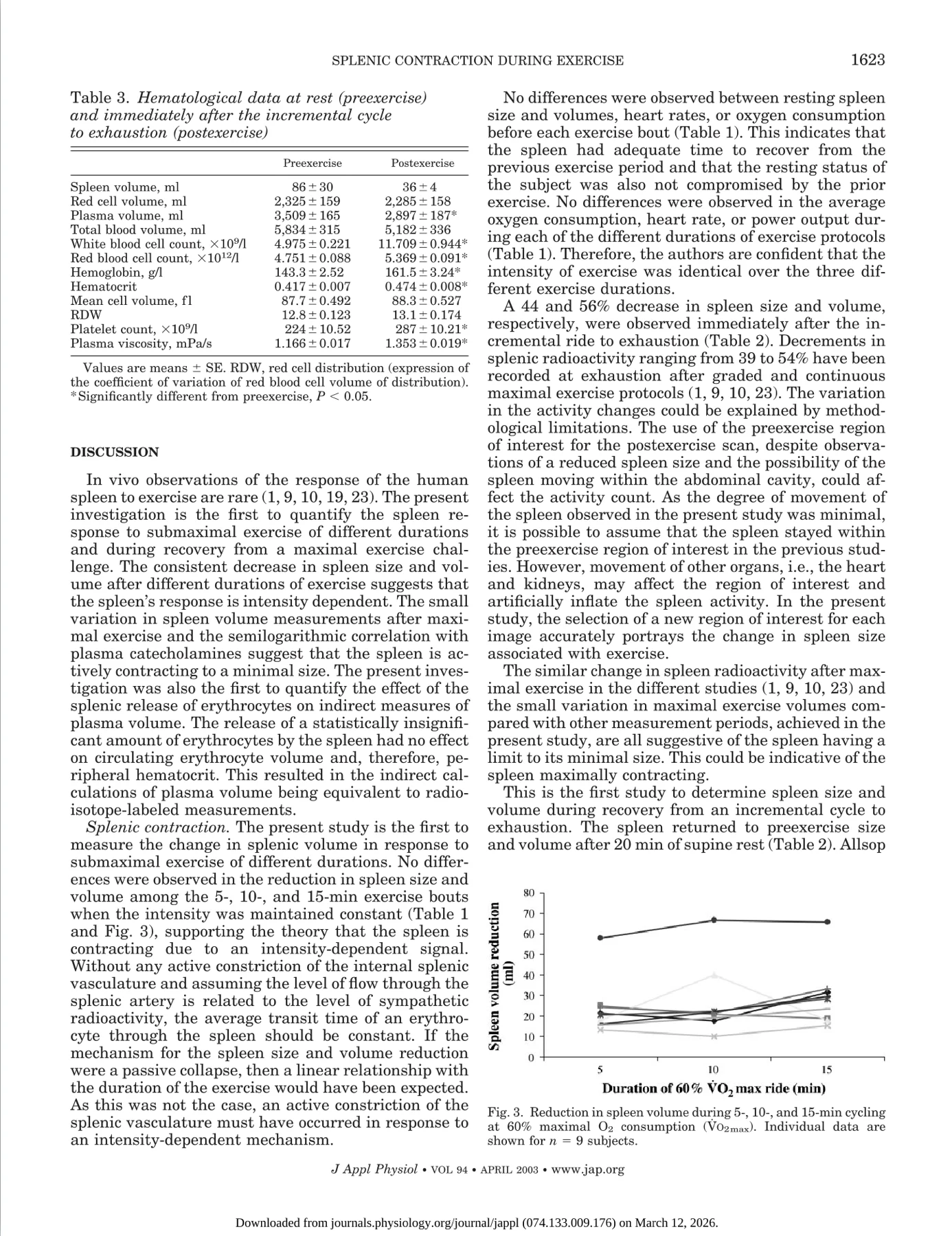 Stewart et al put patients through a sub-maximal and exhaustive cycle workout and measured peripheral blood counts and splenic activity.