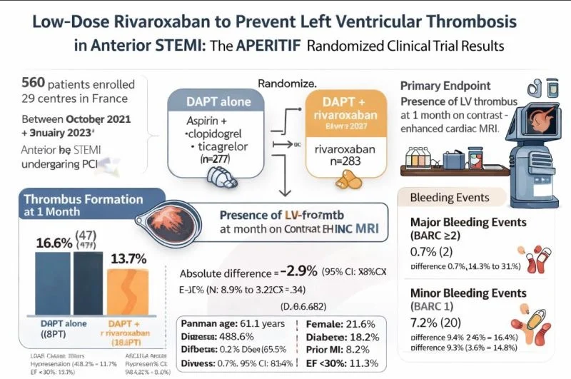 ”The APERITIF randomized clinical trial evaluated whether adding low-dose rivaroxaban (2.5 mg twice daily for 4 weeks) to dual antiplatelet therapy (DAPT) reduces left ventricular (LV) thrombus formation after anterior ST-segment elevation myocardial infarction (STEMI).