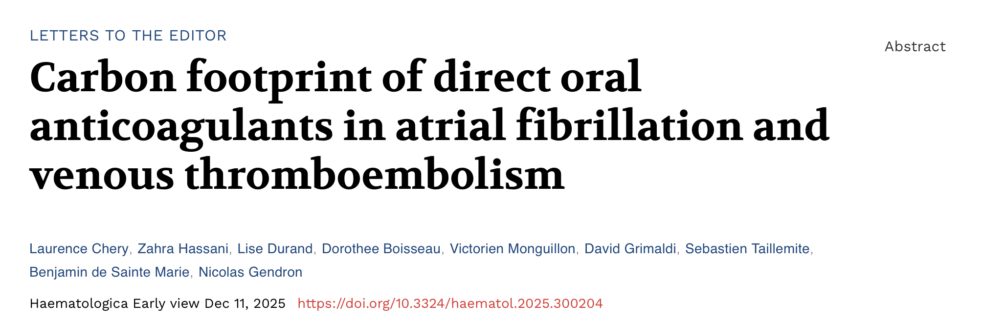 Our study, published in Haematologica Journal, compares for the first time the carbon footprint of the three DOACs used in France (dabigatran, apixaban, rivaroxaban) using two life cycle analysis databases, Ecovamed and MCF.