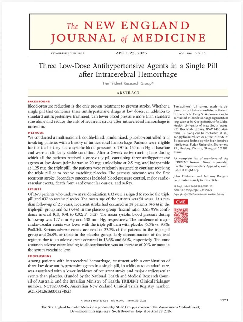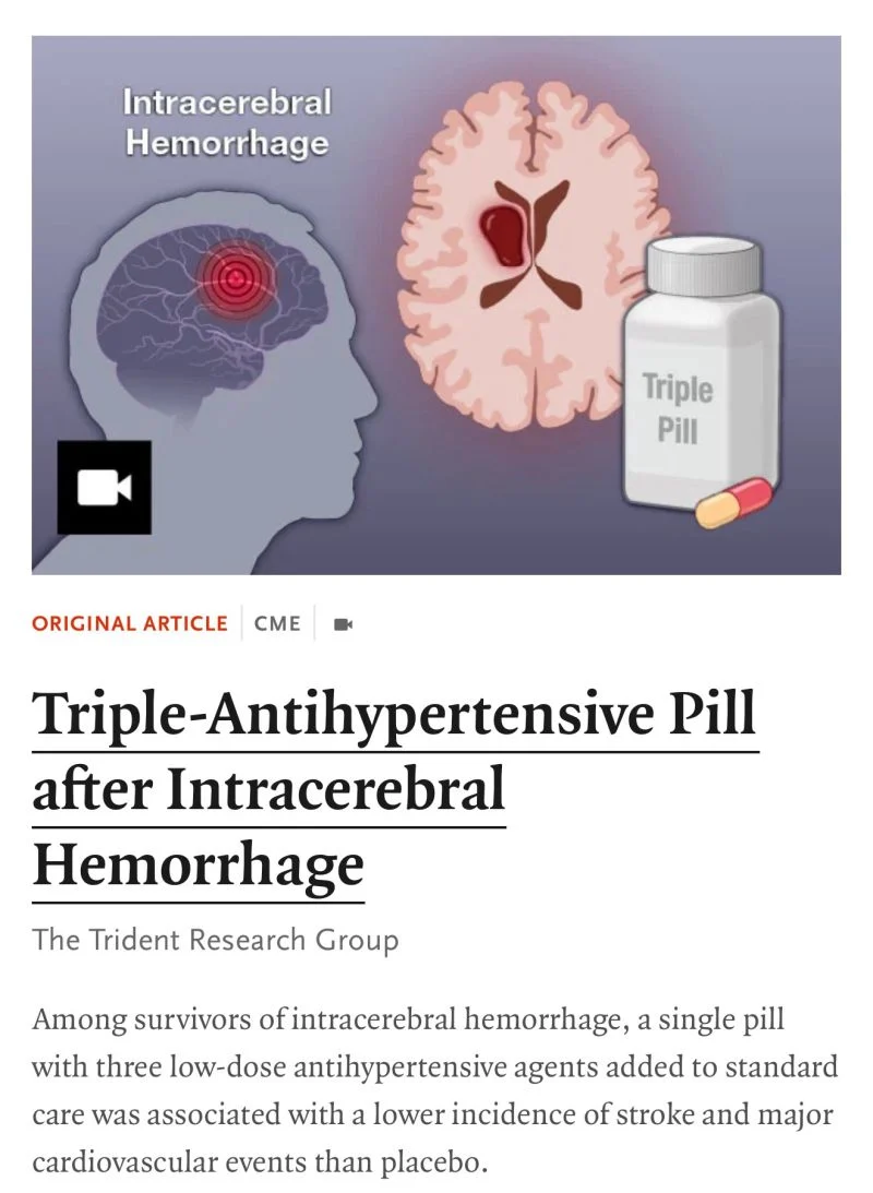 This landmark study showed that, among survivors of intracerebral hemorrhage, a single pill combining three low-dose antihypertensive agents reduced recurrent stroke and major cardiovascular events, reinforcing the central importance of sustained blood-pressure control after ICH.