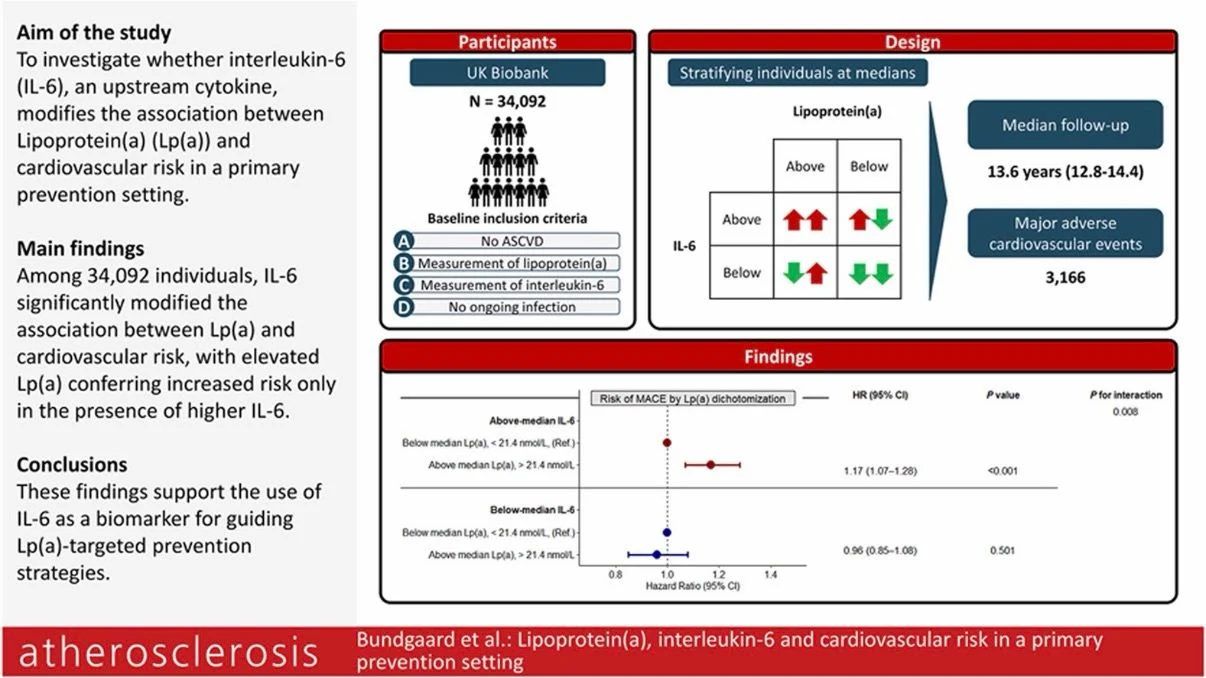 New data from UK Biobank (n=34,092): In primary prevention, the cardiovascular risk associated with elevated Lp(a) was significantly influenced by IL-6, a key upstream inflammatory cytokine.