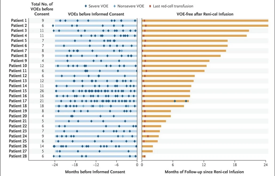Study summary: ‘Reni-cel’ The first in-human CRISPR/ Cas12a gene-editing therapy for Sickel cell diseases shows excellent improvements in clinical outcomes. Out of 28 patients treated, 27 have experienced a complete resolution of painful sickle cell crises and the safety and toxicity as consistent with other Gene Editing therapies that use myeloablative busulfan conditioning therapy.