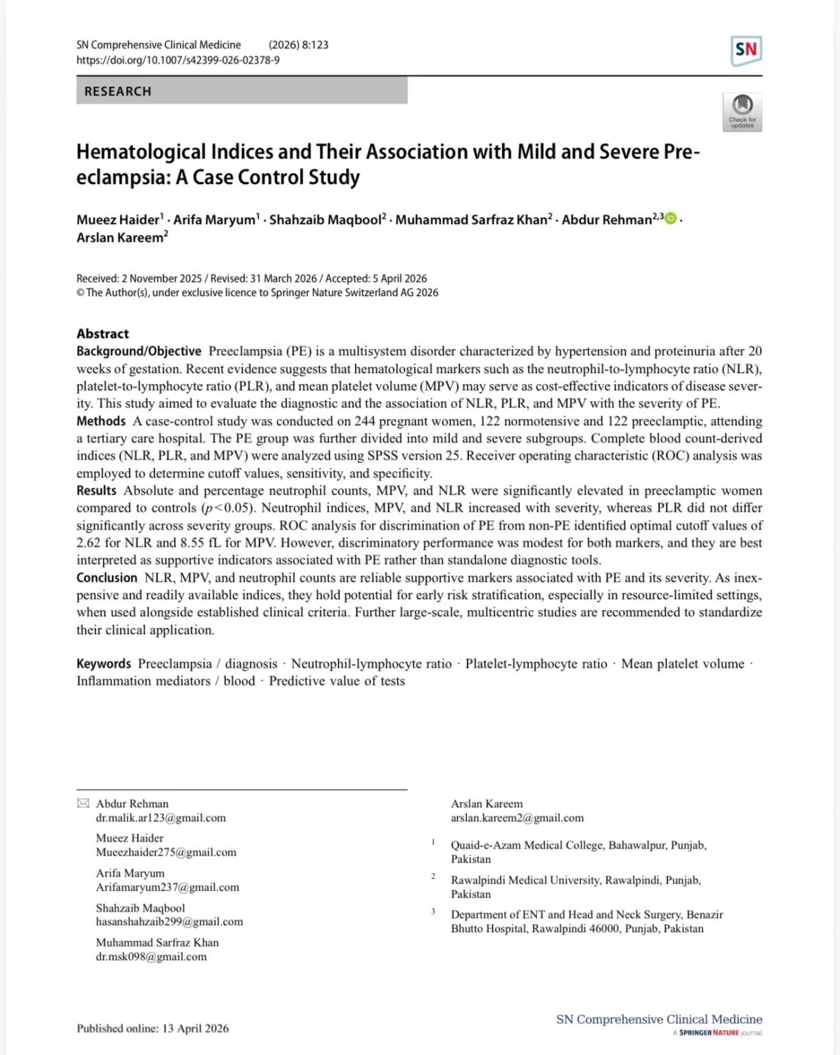 ”Excited to share our recent publication on hematological indices in preeclampsia.