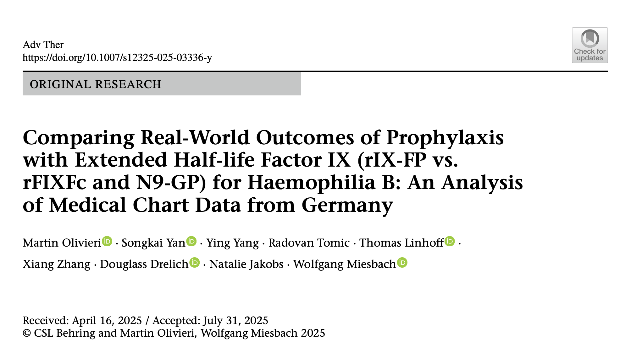 ”Thrilled to share new real-world data from Germany comparing three extended half-life Factor IX products for Haemophilia B prophylaxis: rIX-FP, rFIXFc, and N9-GP!