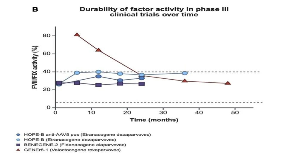 Phase III trials of valoctocogene roxaparvovec (haemophilia A) and etranacogene dezaparvovec (haemophilia B) have shown durable factor expression for up to 5 years, with persons with haemophilia achieving factor levels in the normal or mild haemophilia range and significant reductions in bleeding rates. The FIX-Padua variant has proven particularly transformative, enhancing treatment efficacy 5- to 8-fold.