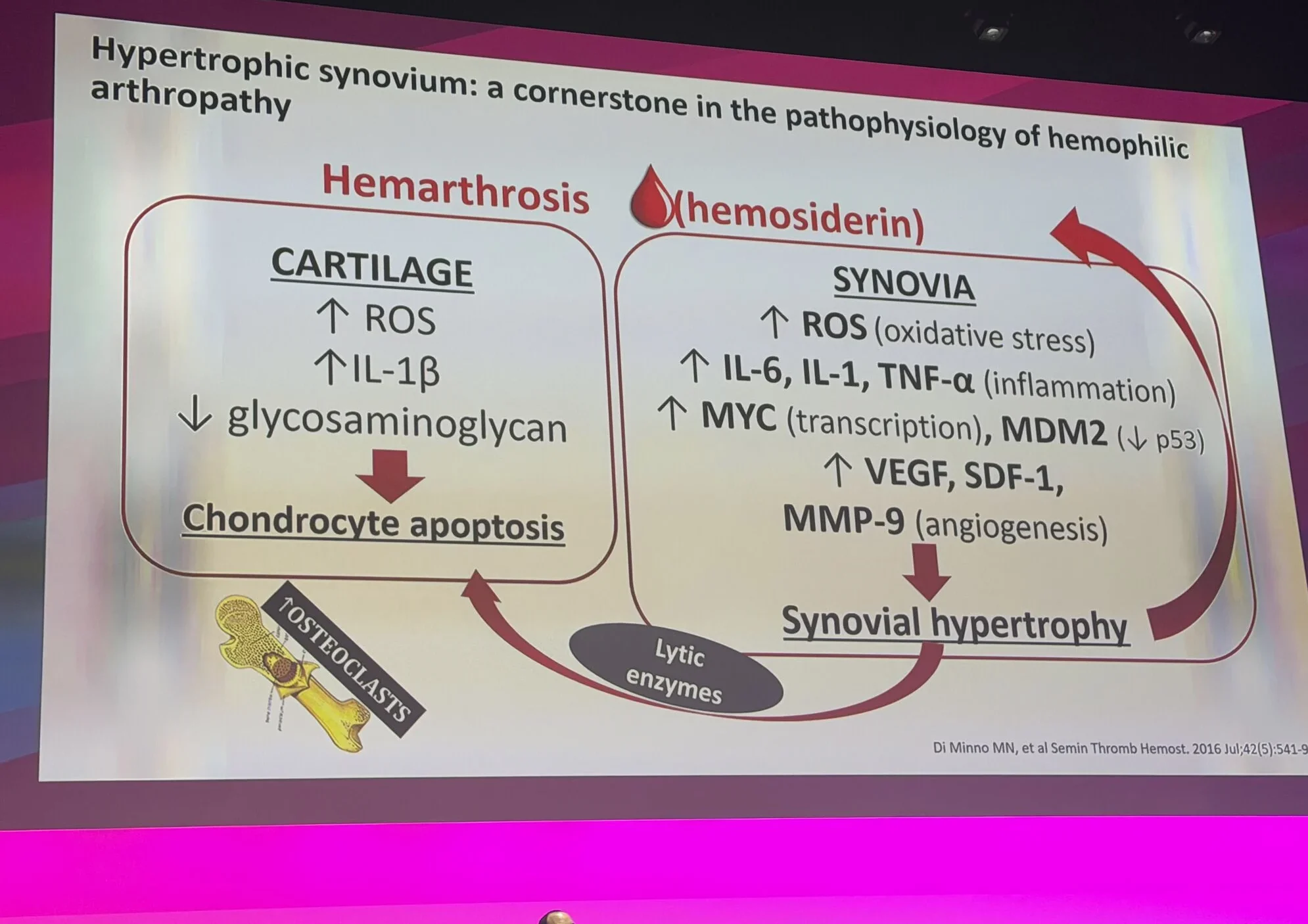 The biology behind it: The pathophysiology slide elegantly walked through the vicious circle: haemarthrosis leads to haemosiderin accumulation, resulting in iron‑driven ROS, IL‑6, IL‑1, TNF‑α, VEGF, MMP‑9, which promote synovial hypertrophy, causing more bleeding and ultimately cartilage apoptosis and osteoclast activation. Once this loop is established, standard troughs are often insufficient to stop it.