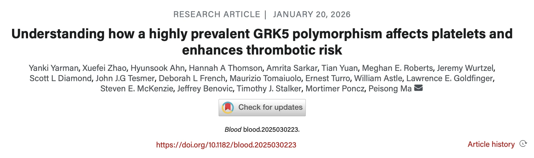 Article: Understanding how a highly prevalent GRK5 polymorphism affects platelets and enhances thrombotic risk