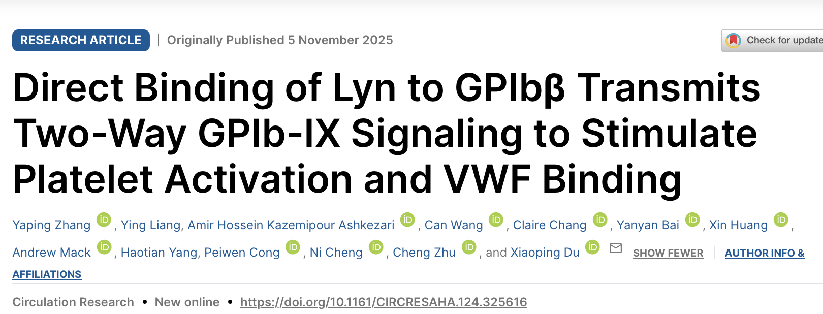 I am proud to share that our NEW paper “Direct Binding of Lyn to GPIbβ Transmits Two-Way GPIb-IX Signaling to Stimulate Platelet Activation and VWF Binding”, is published in Circulation Research and ONLINE today!