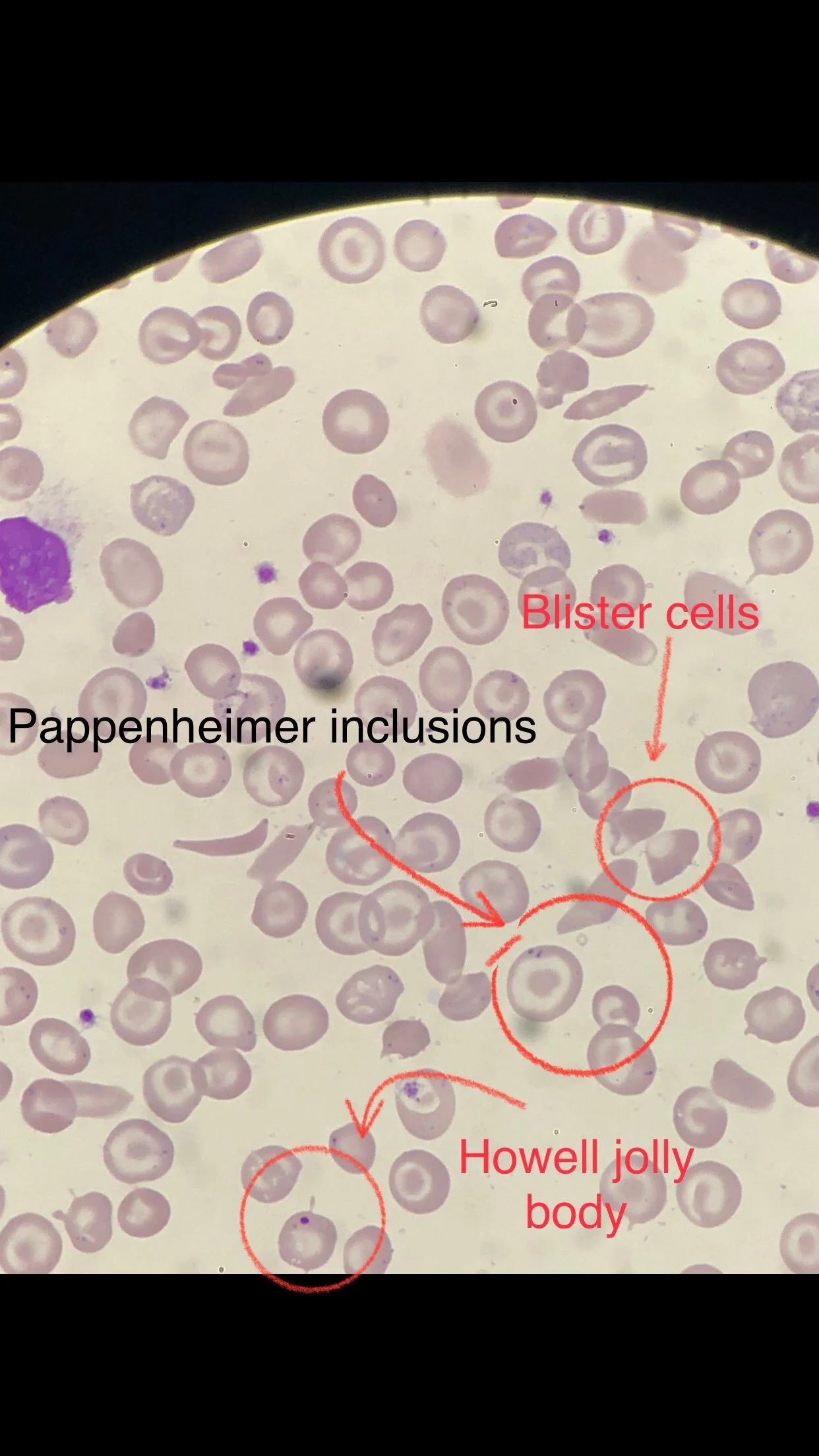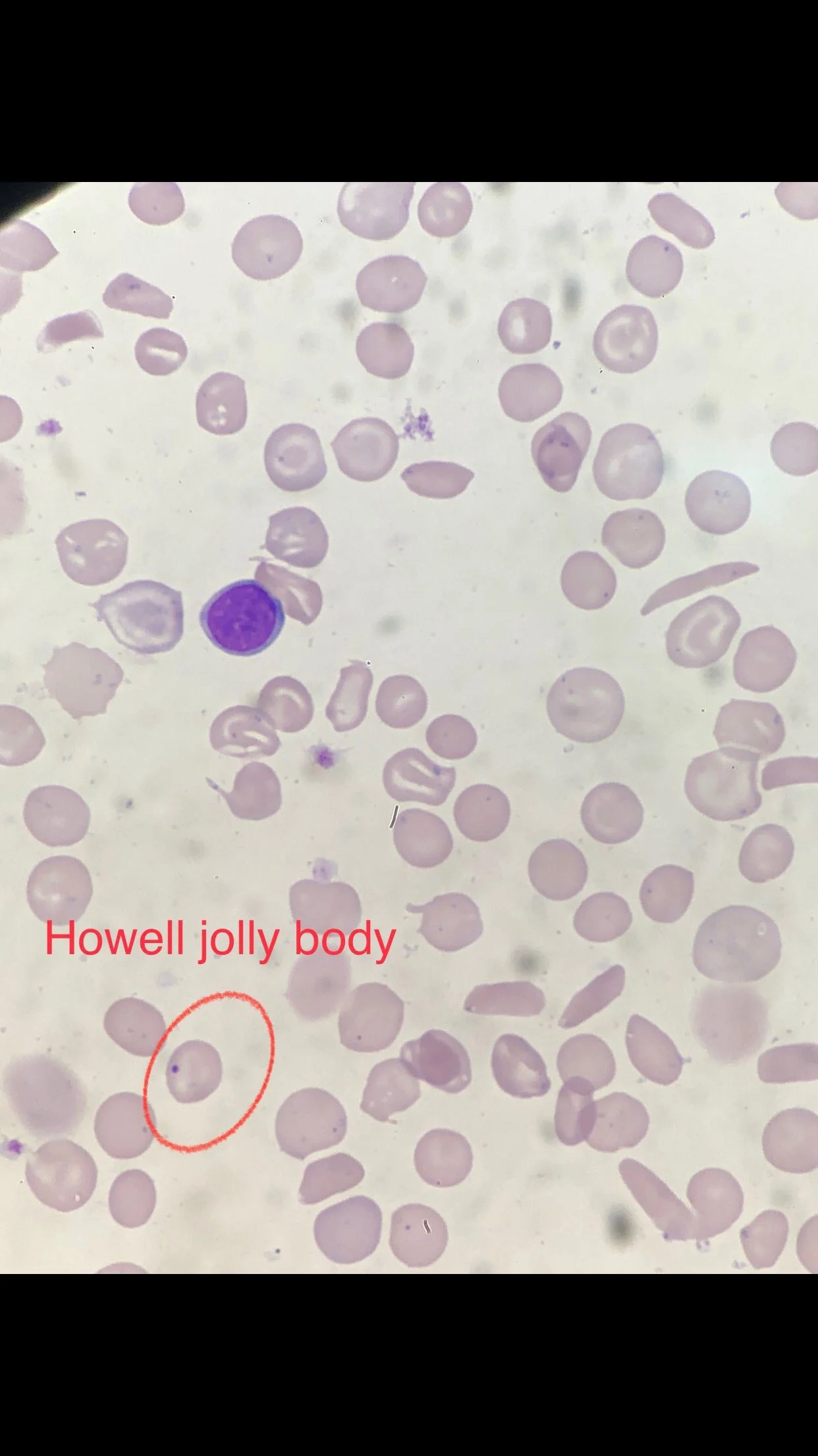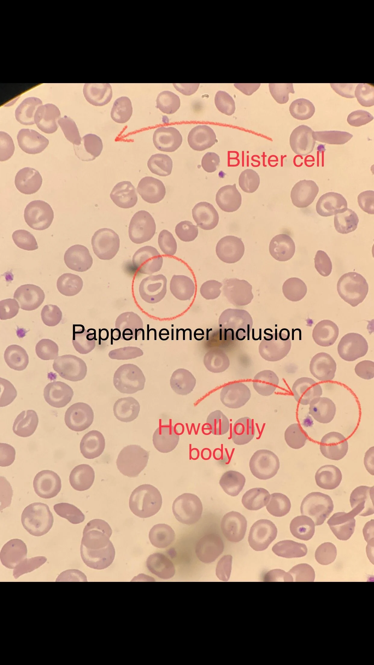 Many sickle cells. Target cells. Spherocytes. RBC fragments. Polychromasia. Pappenheimer inclusions. Howell jolly bodies. ovalocytes. but we also have bite cells and blister cells very clear!