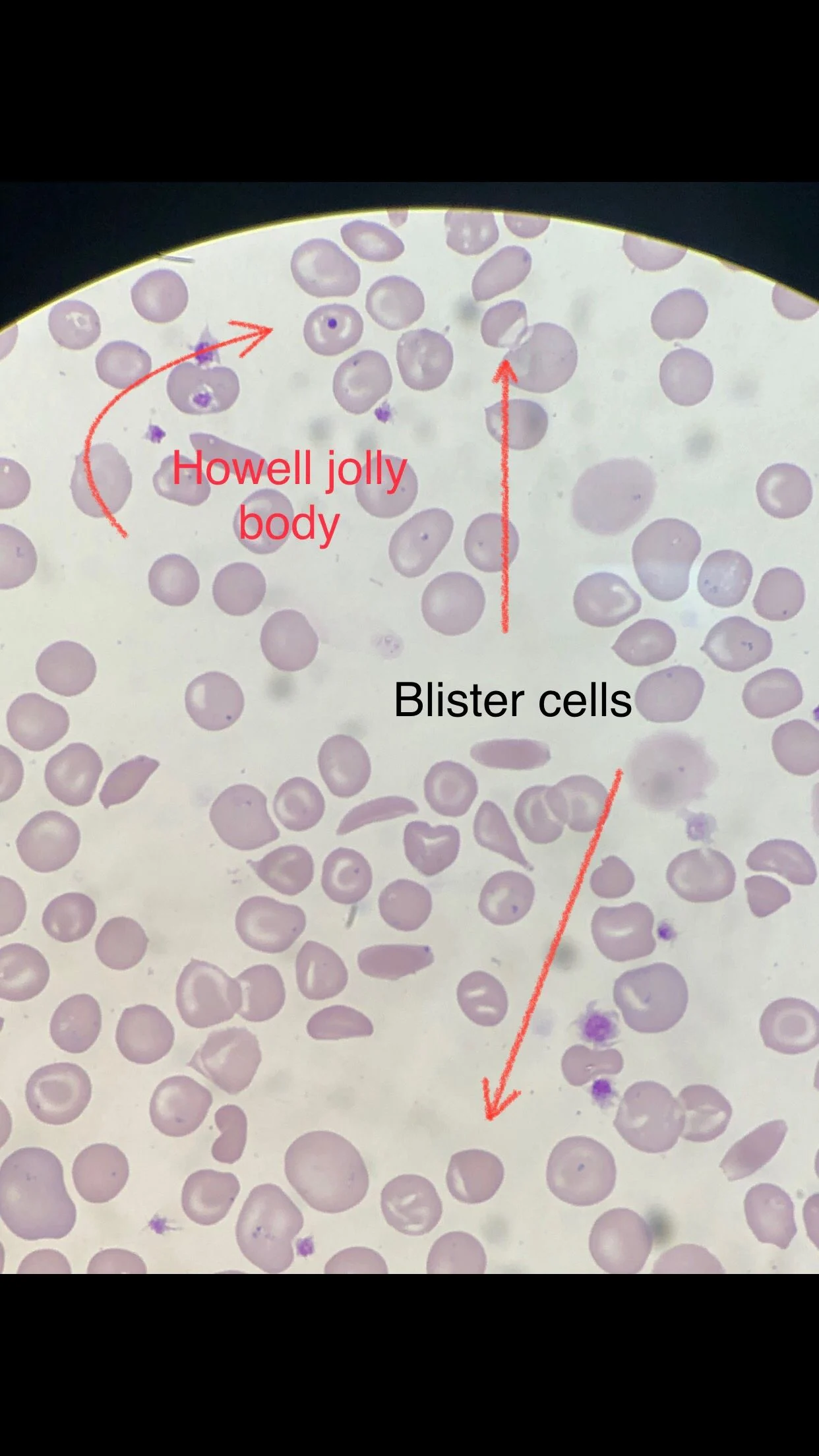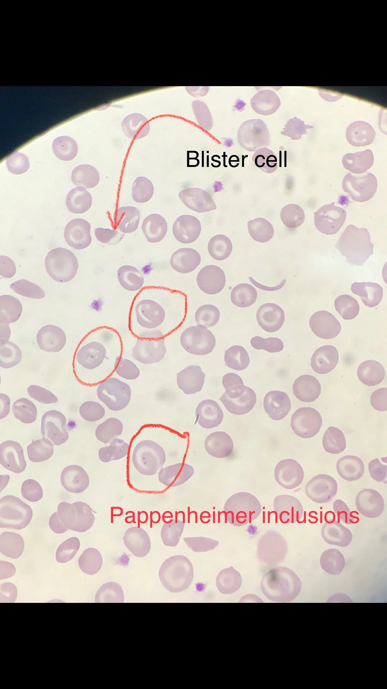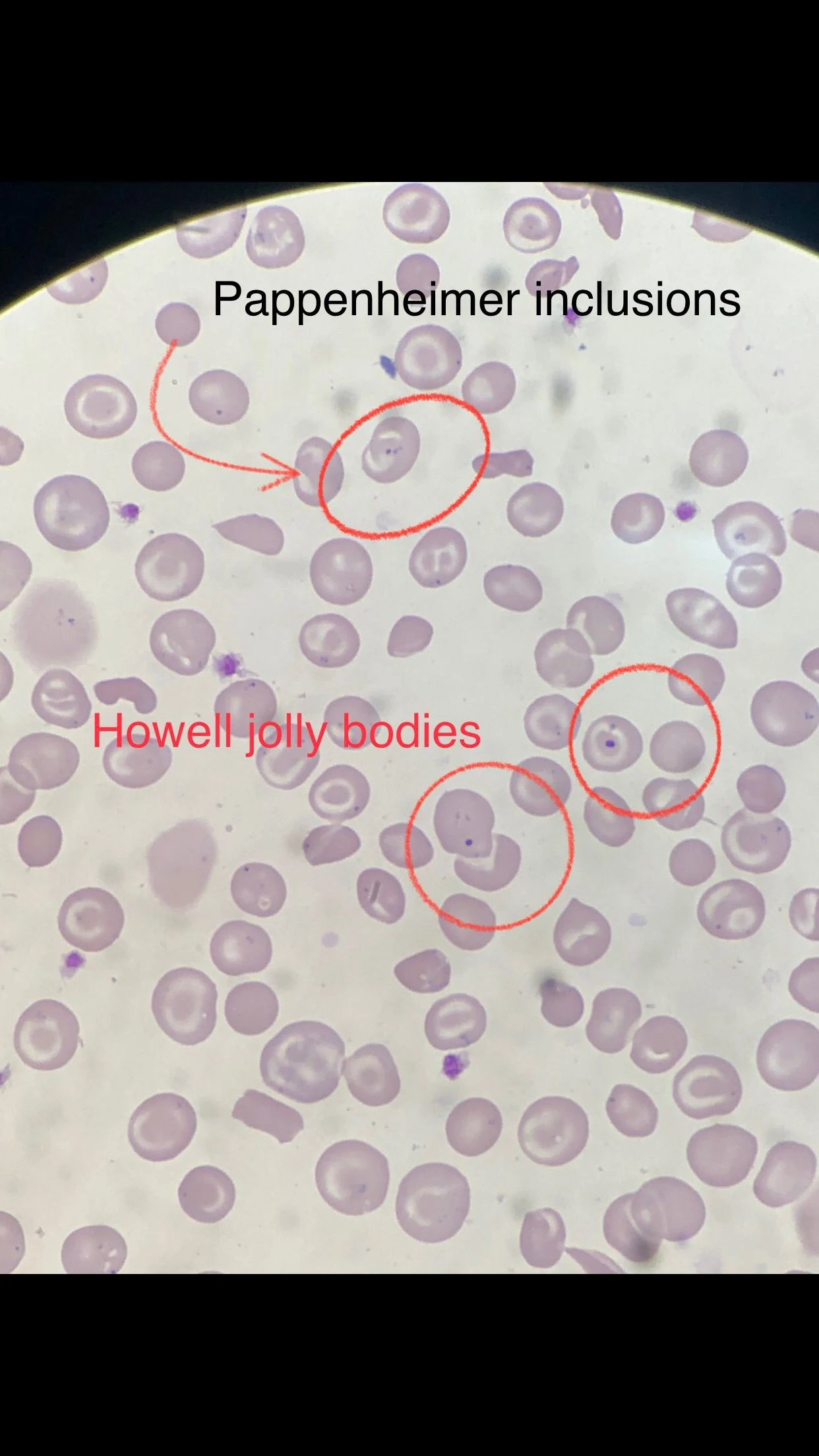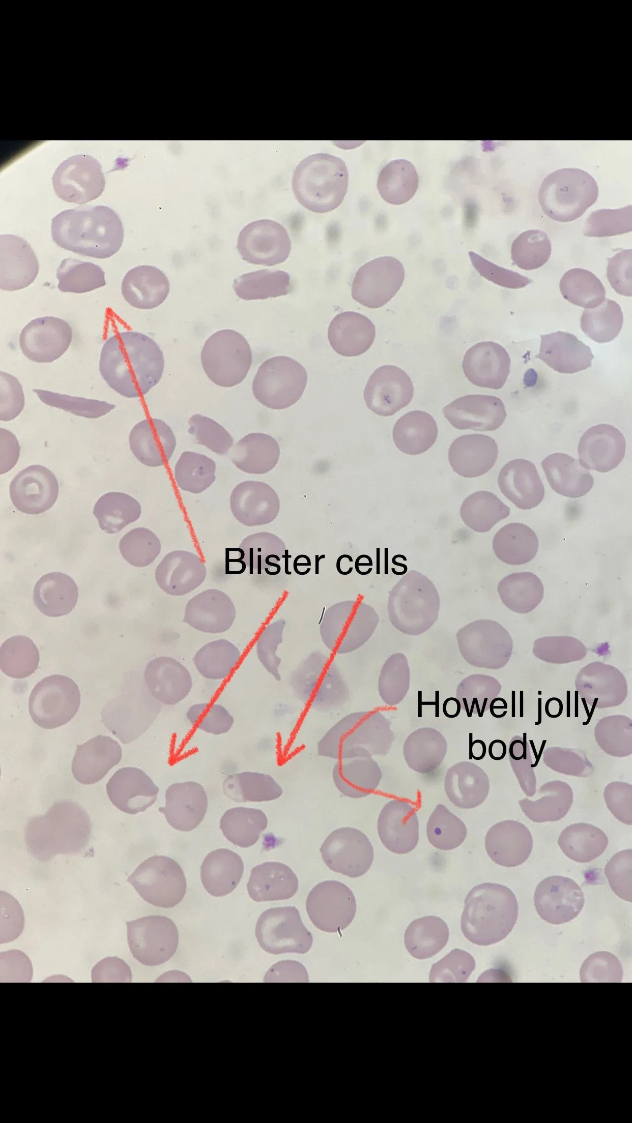 Many sickle cells. Target cells. Spherocytes. RBC fragments. Polychromasia. Pappenheimer inclusions. Howell jolly bodies. ovalocytes. but we also have bite cells and blister cells very clear!