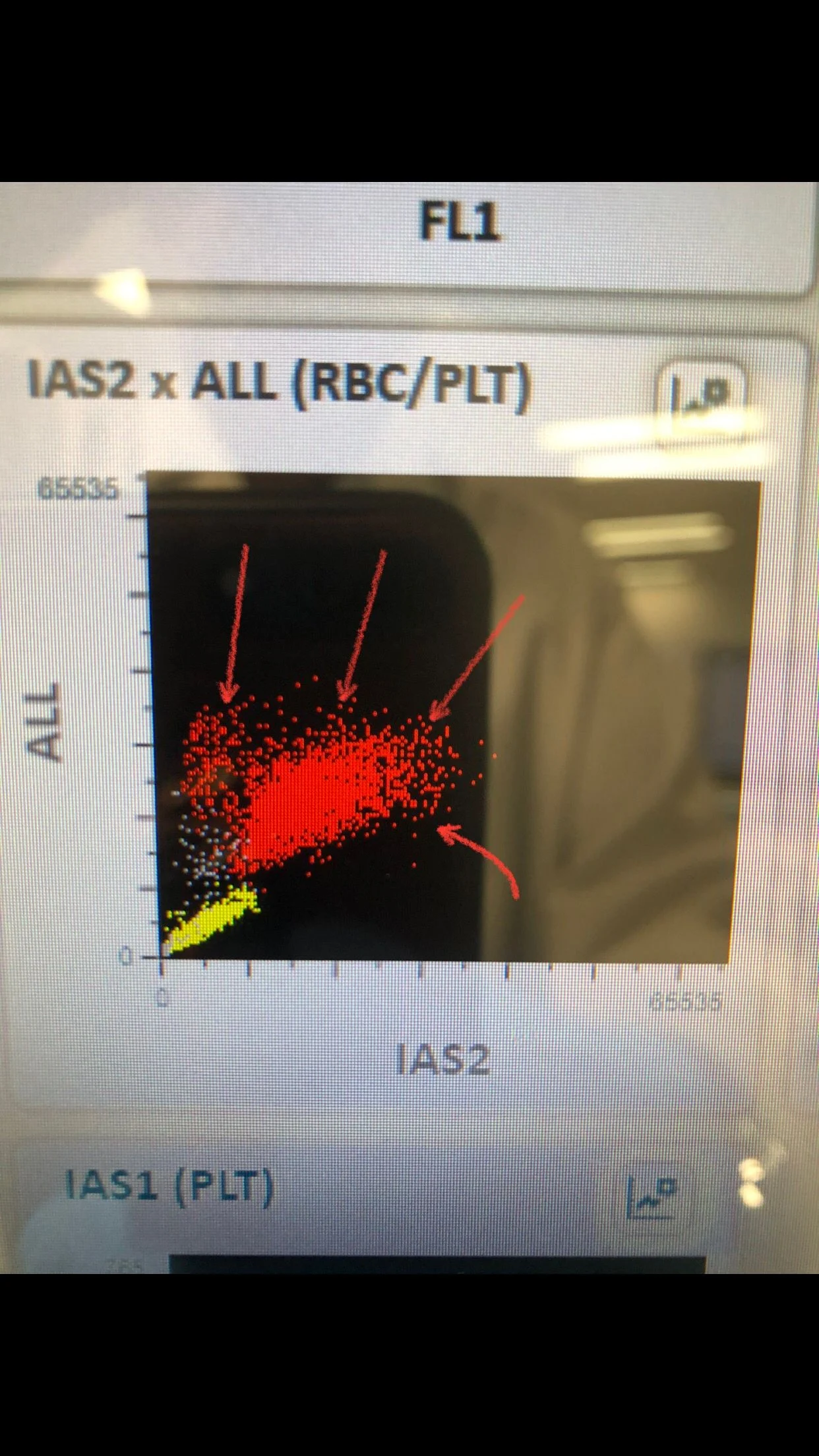RBCs scatter shows 4 different populations and there is clear area between RBCs (red), and platelets (yellow) meaning the machine count them accurately and there is no interference between both.