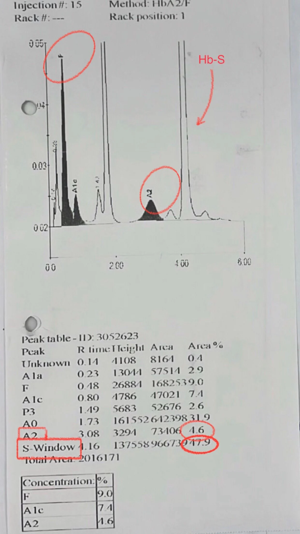But Hb-A2 was high 4.6 %. meaning he has beta thalassemia trait. so this poor young man has sickle cell disease. beta thalassemia trait (sickle beta Thal) and G6PD deficiency.