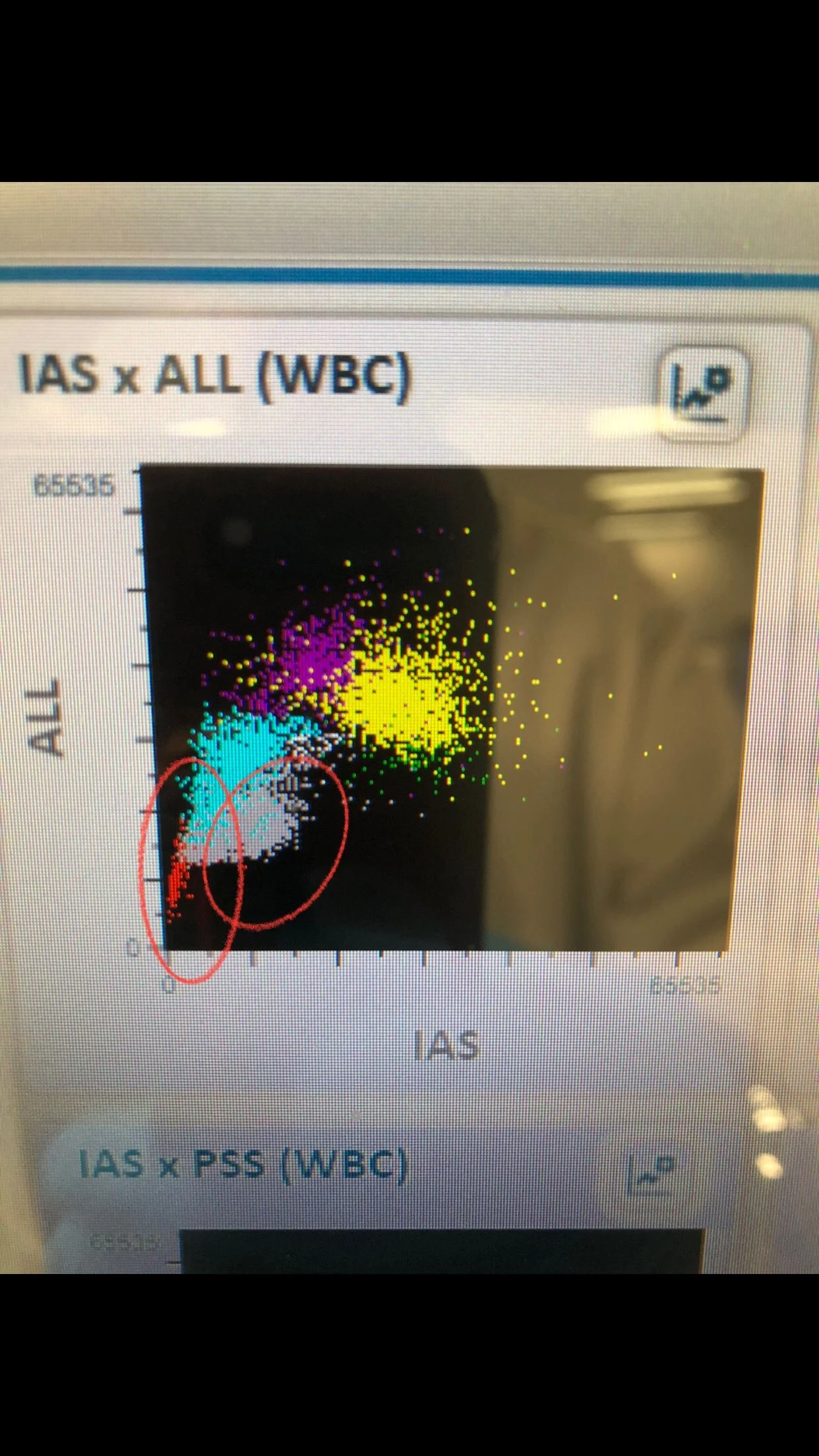 WBCs scatter shows majority of Neutrophils (yellow color), gray color scatter for Schistocytes or sickle cells (unknown remains cells not WBCs), and very few red color scatter for the few NRBCs present in the sample.